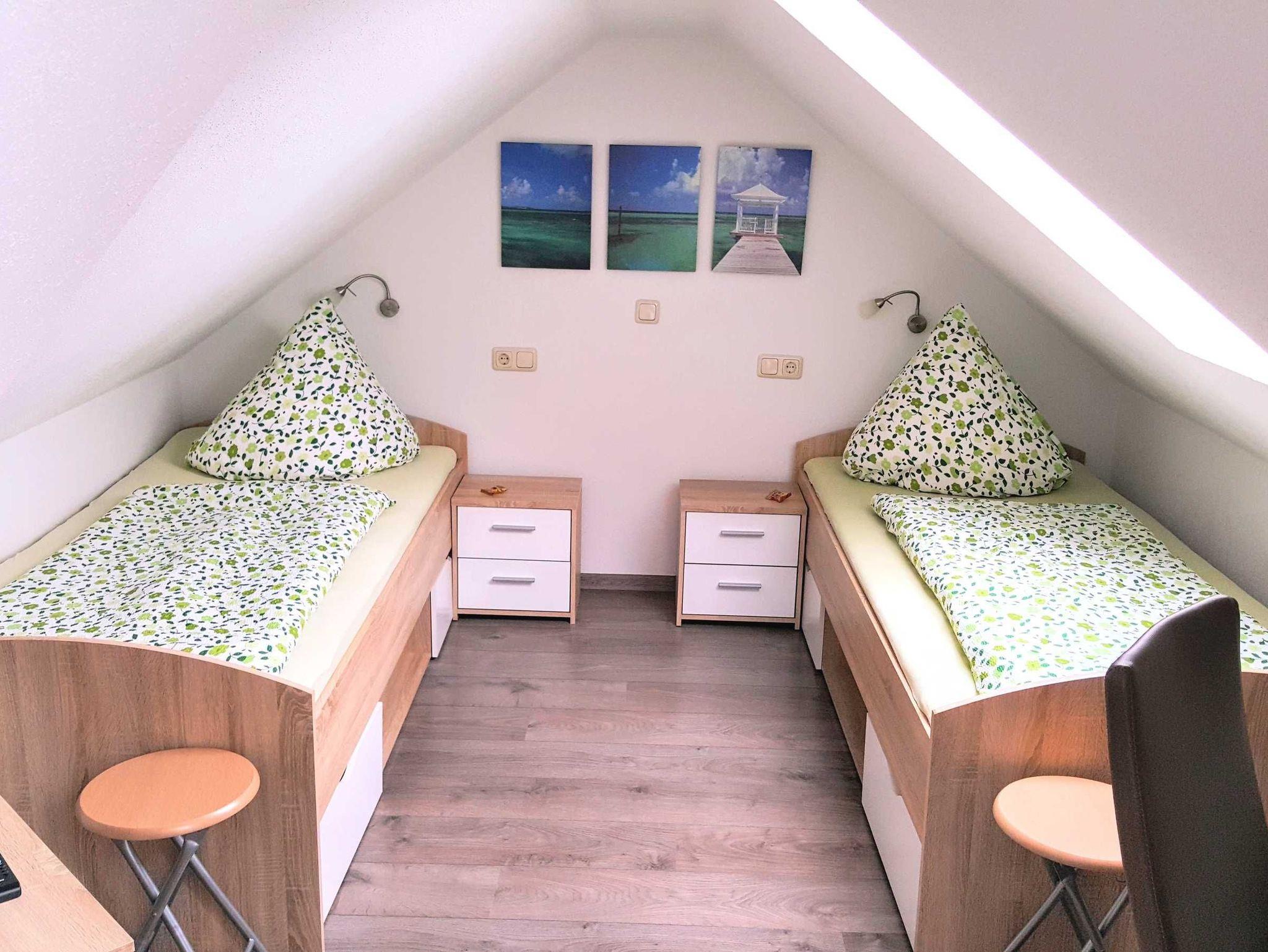 Über eine Raumspartreppe/Wendeltreppe gelangen Sie ins zweite kleine Schlafzimmer im Dachgeschoss mit zwei Einzelbetten und einem Flachbildfernseher mit DVD-Player.
