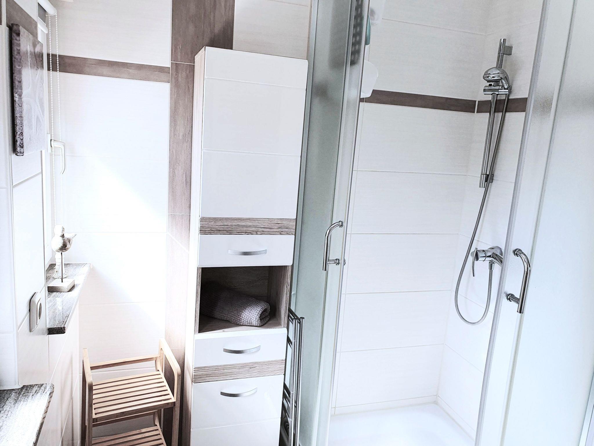 Angeschlossen sind das kleine Schlafzimmer mit 2 Betten und einer Nische und das moderne Bad mit Dusche/WC. sowie die große möblierte und überdachte Terrasse mit Blick auf unser Grundstück und Gärten. Die Betten haben einen geräumigen Bettkasten und sind am Kopf- und Fußende verstellbar.
