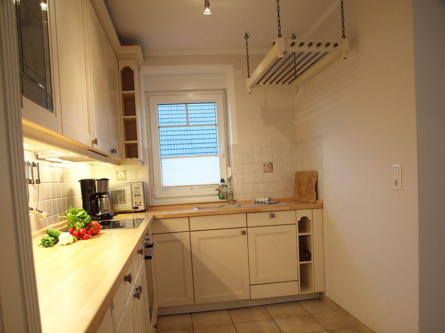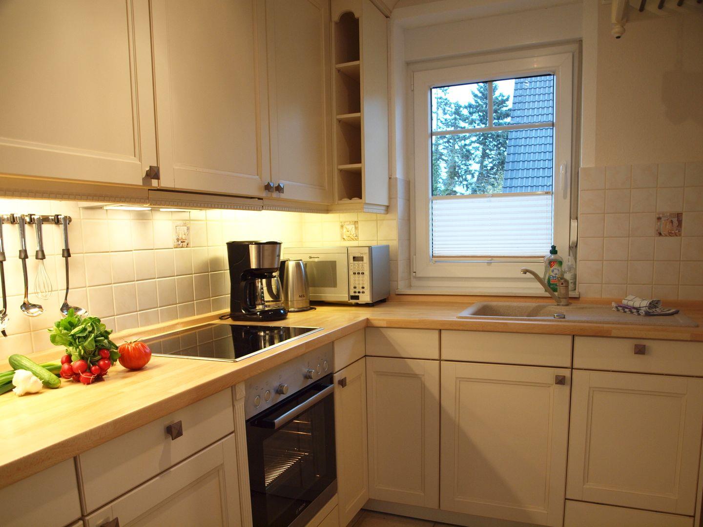 Die offene Küche lässt keine Wünsche offen und ist mit allem ausgestattet, was Sie für die Zubereitung Ihrer Mahlzeiten benötigen. Neben einem Herd mit Ceranfeld, einem Backofen, einer Mikrowelle und einer Spülmaschine verfügt die Küche auch über einen Kühlschrank mit Gefrierfach, eine Kaffeemaschine, einen Wasserkocher und einen Toaster. Ein gemütlicher Esstisch bietet Raum für gemeinsame Mahlzeiten und gesellige Abende.