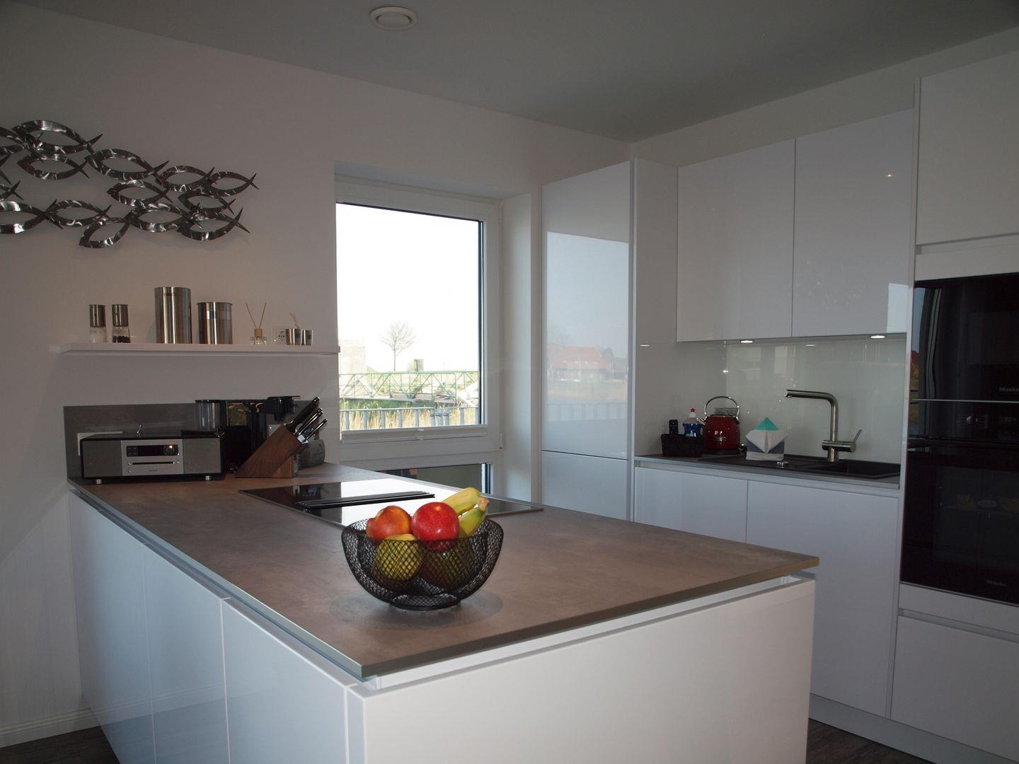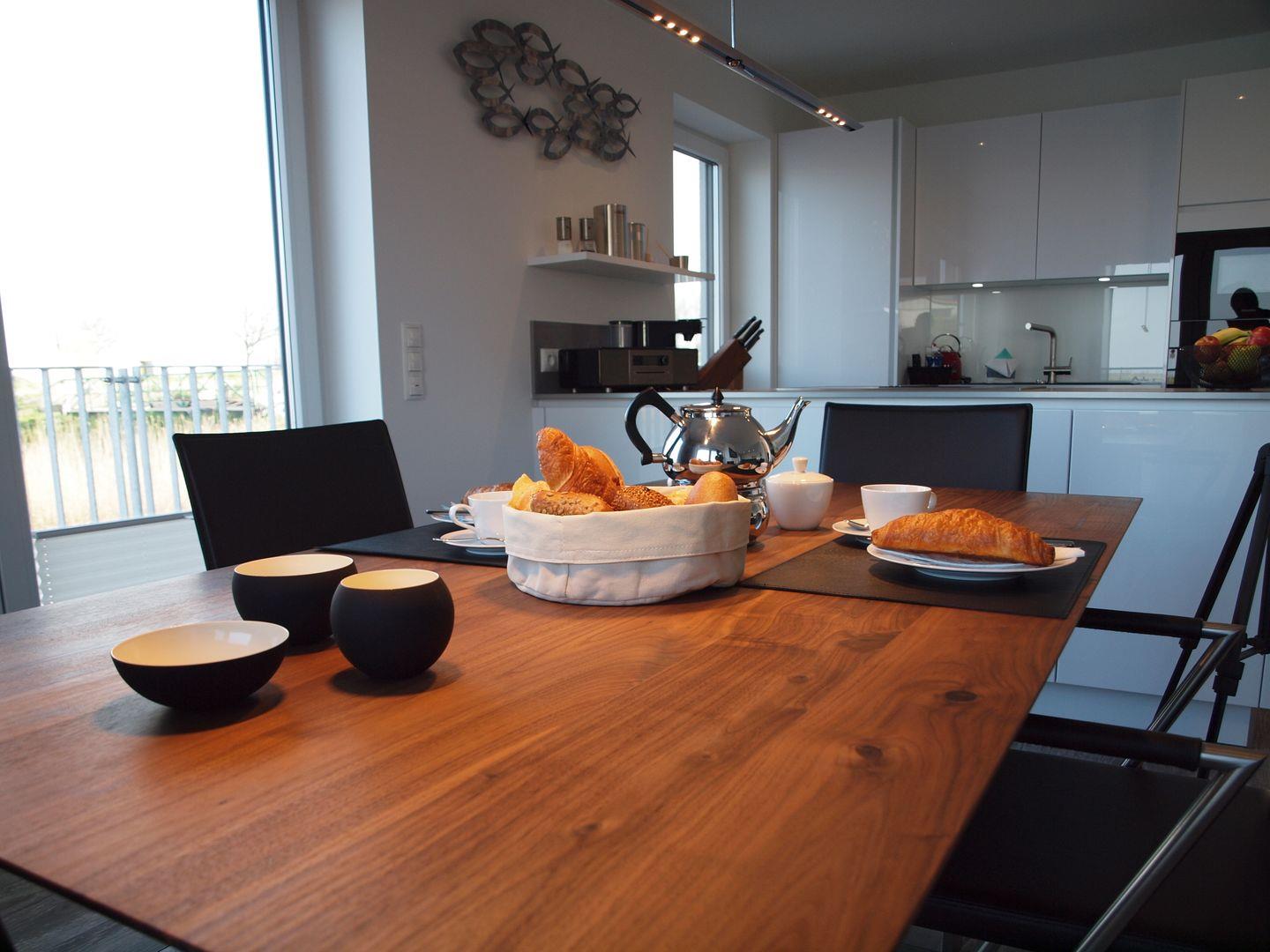 Das lichtdurchflutete Erdgeschoss mit Zugang zur Terrasse, besticht mit seiner modernen und komfortablen Einrichtung. Die Küche ist mit in den Wohn- und Essbereich integriert und mit hochwertigen Geräten ausgestattet. Die ca. 25m² große Sonnenterrasse lädt zum Verweilen ein. Von hier aus haben Sie einen wunderbaren Ausblick auf den nostalgischen Raddampfer, der über die Harle schippert.
