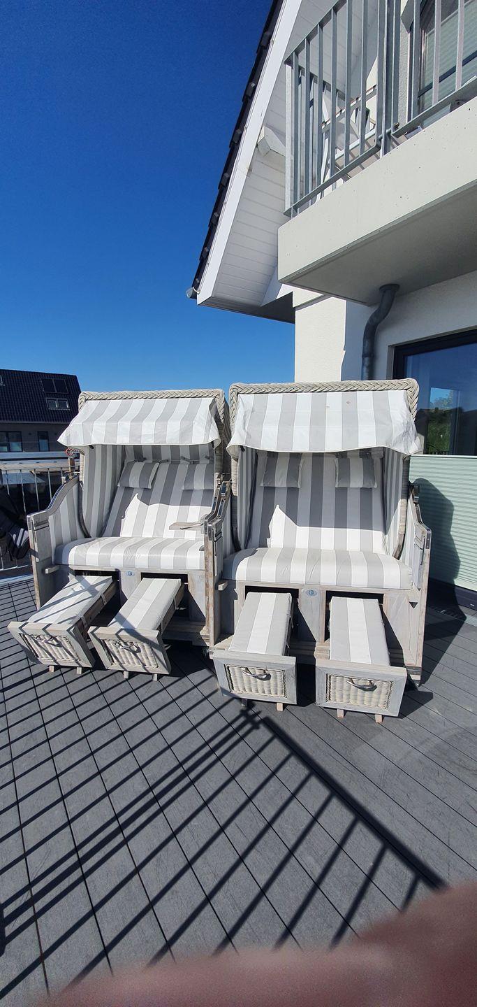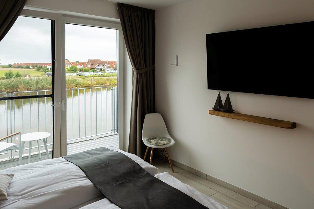 Das Obergeschoss verfügt über 2 Schlafzimmer mit komfortablen Betten (200 x 200 cm), viel Stauraum für Ihre Garderobe, sowie jeweils Smart-TV. Von hier aus haben Sie direkten Zugang zum bestuhlten Balkon zur Wasserseite.