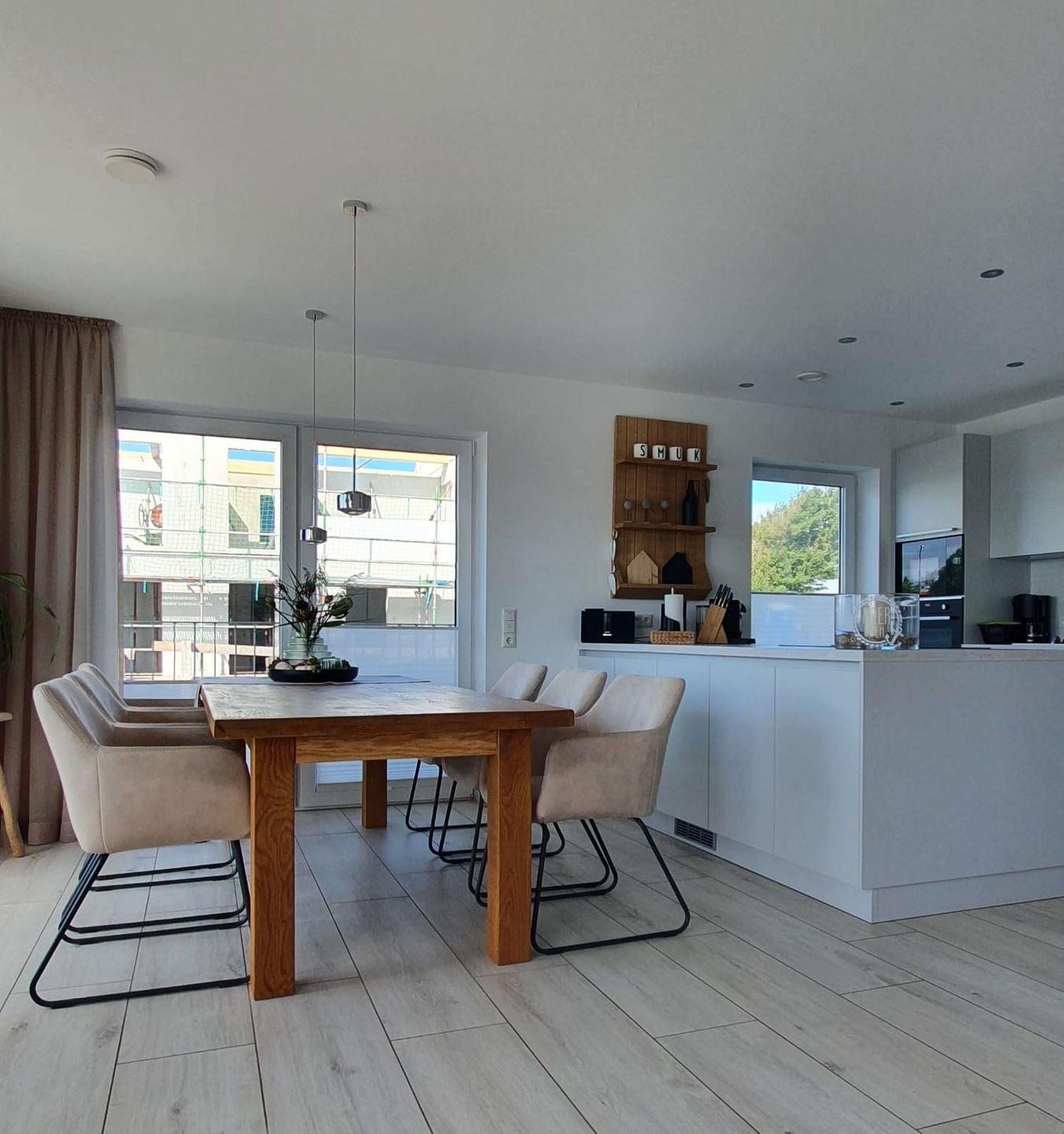 Der helle, offene Wohn-/Essbereich im Untergeschoss ist geräumig und modern eingerichtet. Von hier aus gelangen Sie unmittelbar auf die 25qm große Terrasse, wo Ihnen Gartenmöbel, Sonnenschirm und 2 Strandkörbe (ca. April – September) zur Verfügung stehen. Über den eigenen Wasserzugang können Sie die 2 zur Verfügung stehenden Stand-Up-Paddleboards und das Ruderboot bequem nutzen.