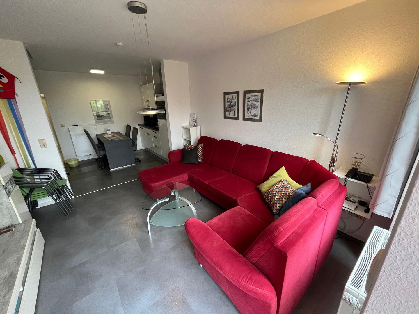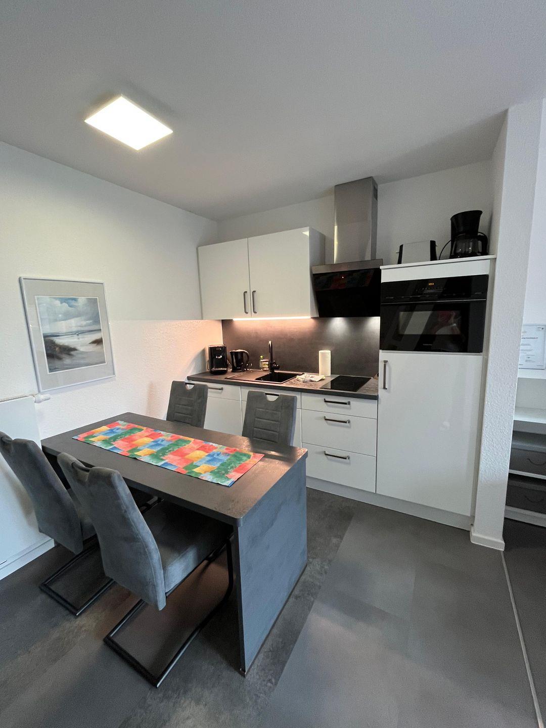 Der offenen Wohnbereich lädt zum Entspannen ein. Hier finden Sie eine gemütliche Sofaecke, die perfekt ist, um nach einem ereignisreichen Tag am Strand zu relaxen. Ein Esstisch bietet genug Platz für gemeinsame Mahlzeiten mit der Familie oder Freunden. Die moderne Küche ist vollständig ausgestattet und lässt keine Wünsche offen: Sie finden einen Herd mit zwei Platten, einen Backofen, einen Kühlschrank mit Gefrierfach, Geschirrspüler und viele weitere Küchenutensilien. Der offene Zugang zur Wohnstube sorgt jenseits von kochtechnischen Aktivitäten dafür, dass Sie in geselliger Runde Unterhaltung genießen können.
