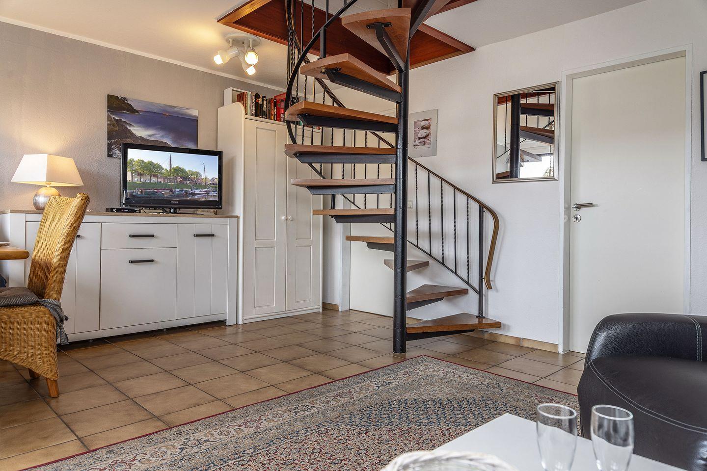 Wohnung "Strandläufer": Charmante Maisonette überzeugt mit großzügigem Wohn- und Essbereich. Die separate Küche und ein modernes Bad mit Dusche und WC runden diese gemütliche Wohnung ab. Über die elegante Spindeltreppe erreichen Sie das Schlafzimmer unterm Dach – ideal zum Entspannen nach einem Tag am Meer.