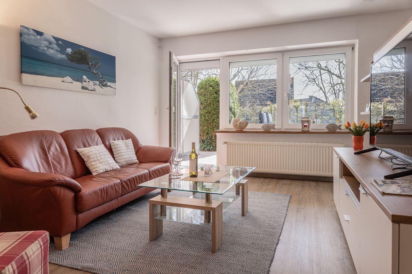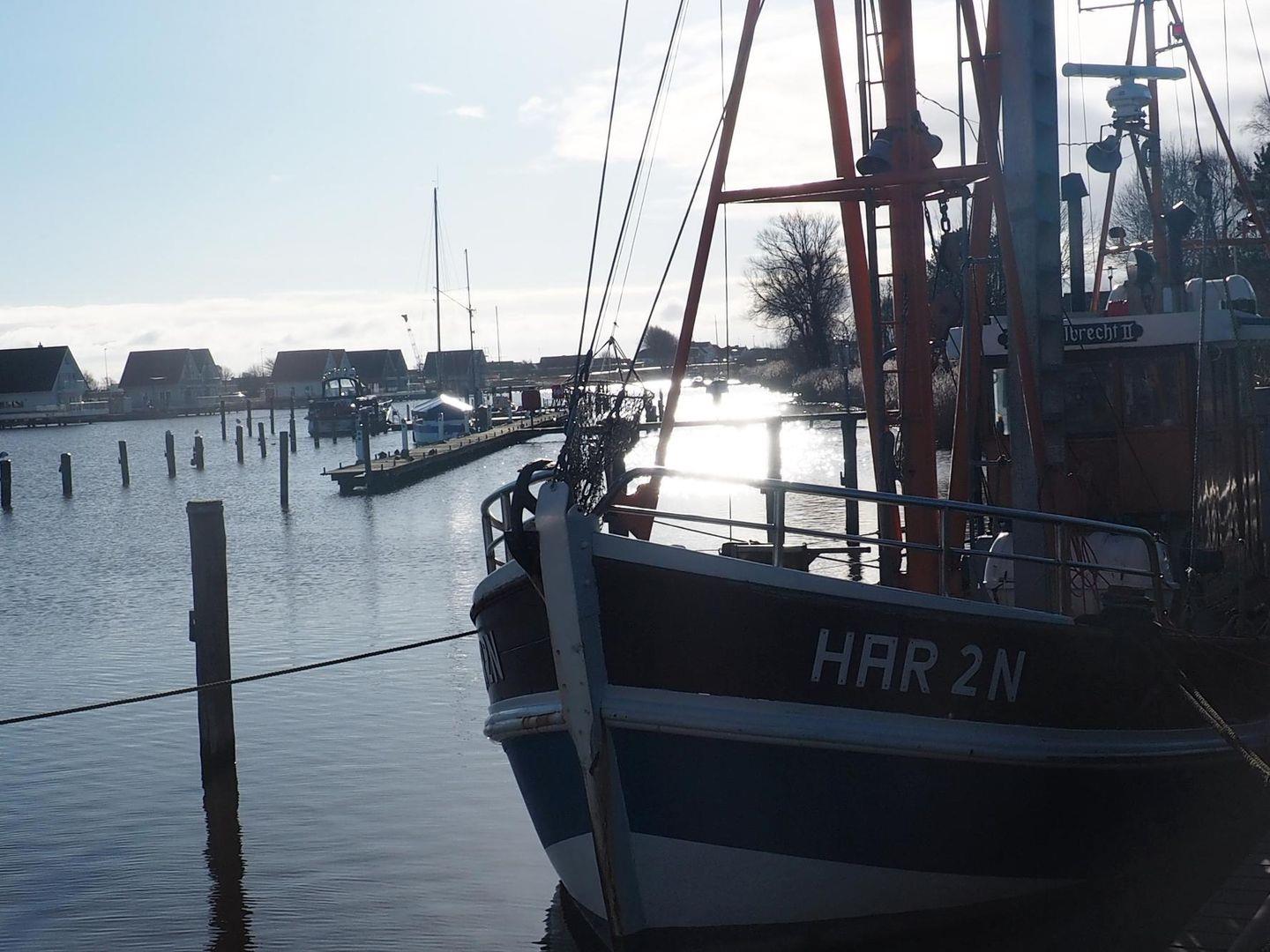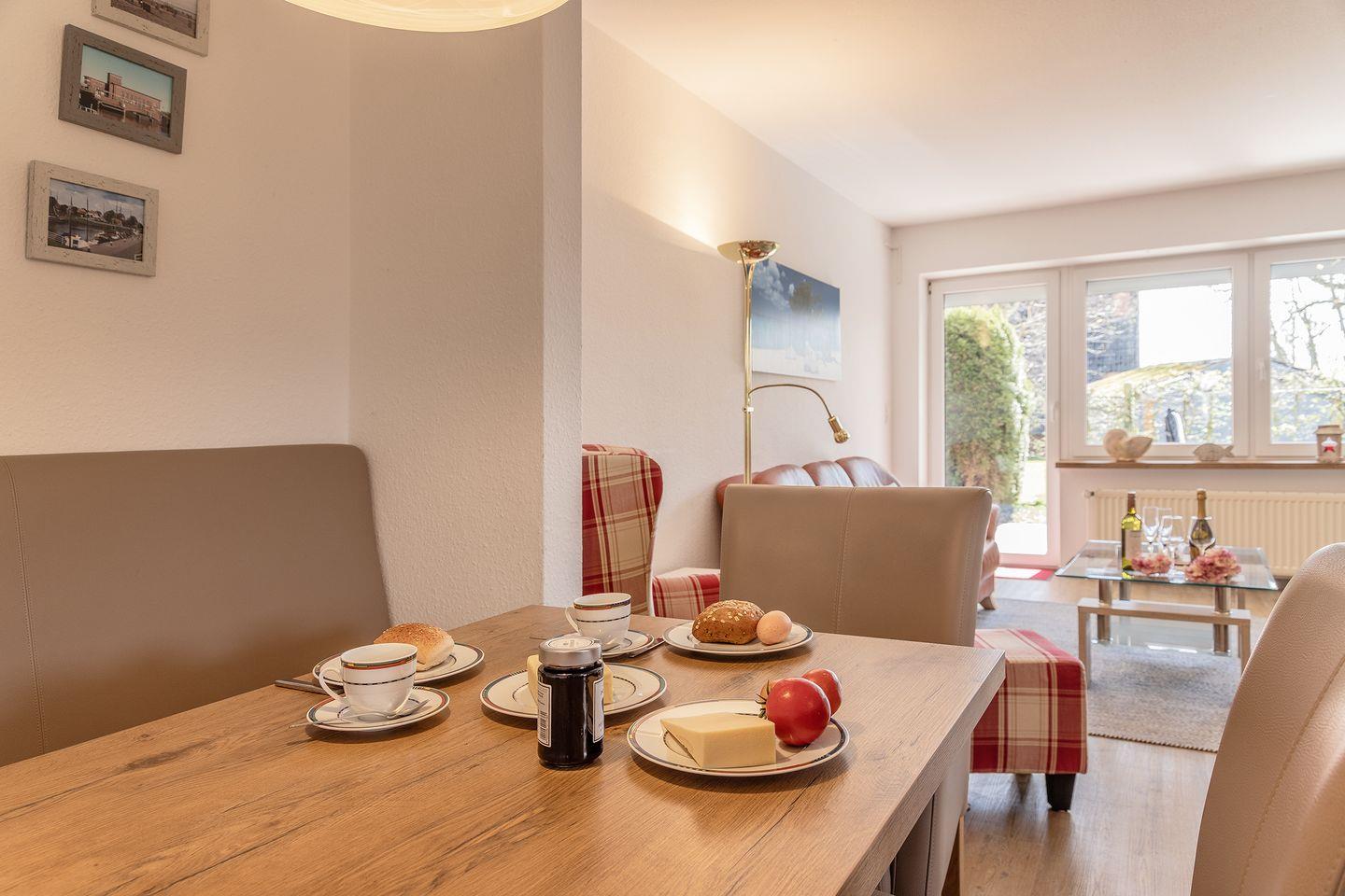 Zum Sonnen bietet sich auch in der kühleren Jahreszeit die windgeschützte Terrasse mit Abendsonne an. Der eigene PKW-Abstellplatz befindet sich direkt am Haus, Abstellraum (abschließbar) für Fahrräder vorhanden, Bollerwagen und Strandspielzeug können kostenfrei genutzt werden. Eine Gehminute zum Yachthafen und 5 Gehminuten bis zum Strand.