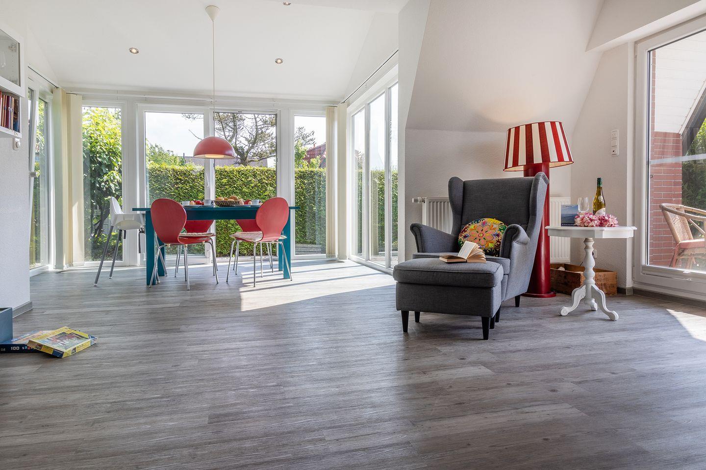 Das Haus hat ein sehr geräumiges Wohn-Ess-Zimmer mit Panorama-Erker, Lesesessel und großer Couch.