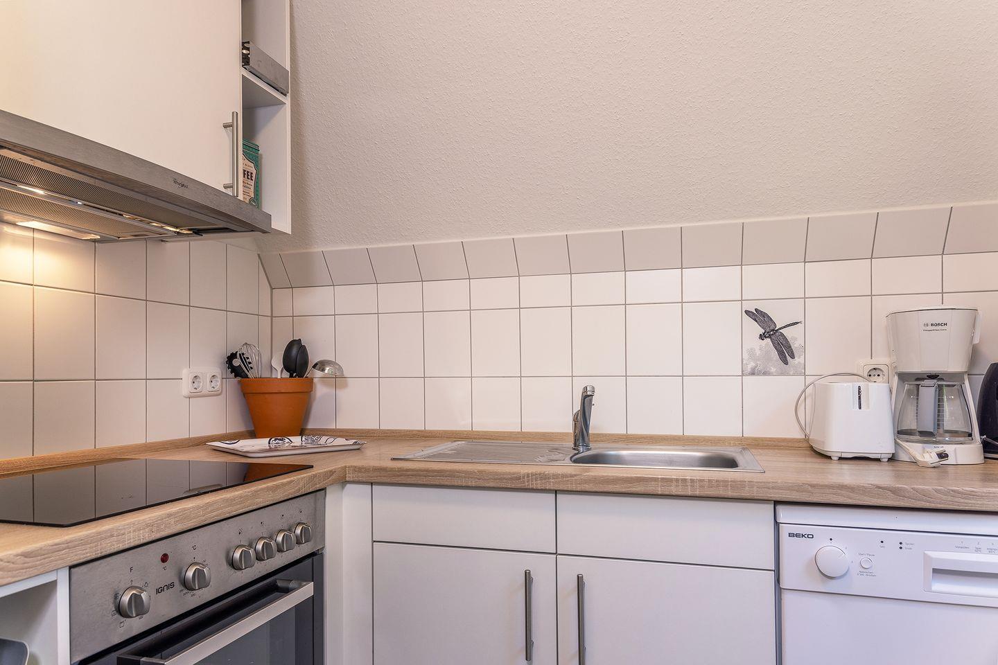 Die kleine Einbauküche ist separat und geht, wie auch das Bad, vom Eingangsflur ab, der ins Wohnzimmer führt. Die Terrasse liegt nach Südwesten.