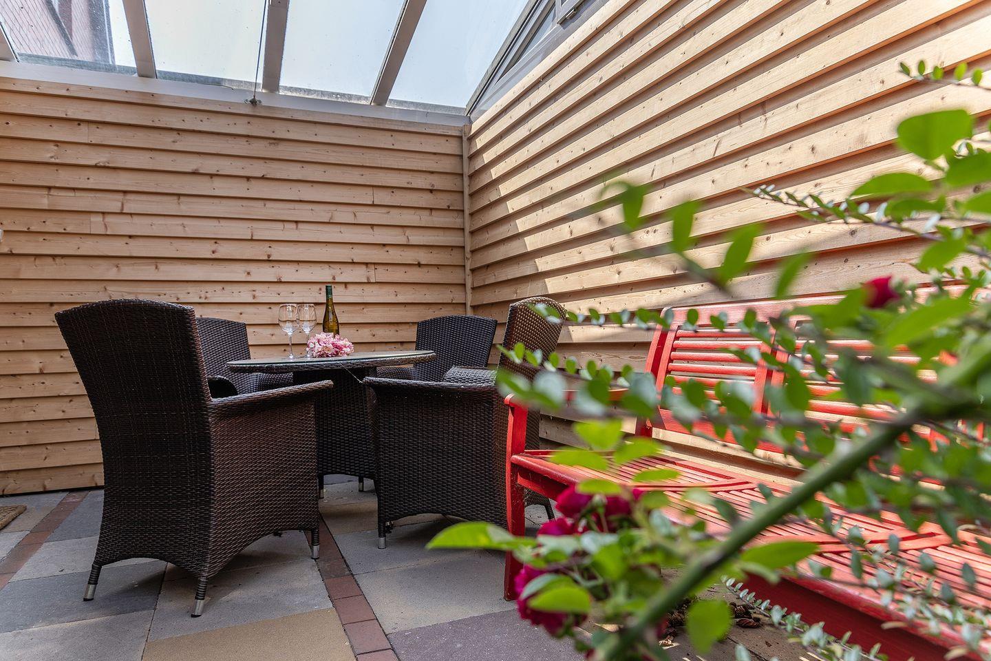 Vor dem Hauseingang befindet sich ein überdachter Freisitz, mit Gartenmöbeln bestückt.