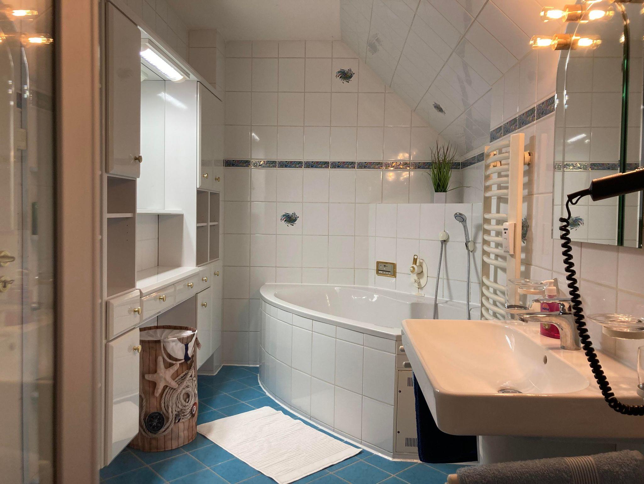 • Bad mit WC, Dusche, Waschbecken, Haartrockner und großer Badewanne