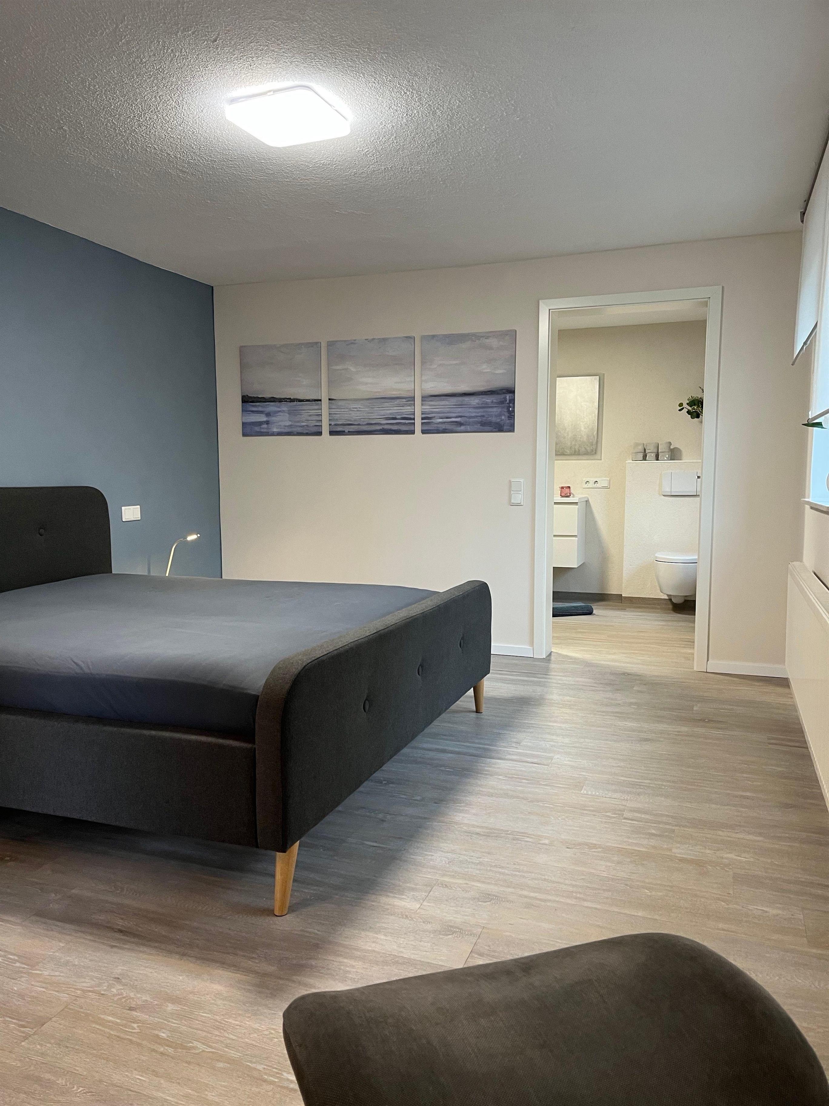 Badezimmer: Waschtischanlage, WC, Dusche mit großer Flügeltür und flachem Einstieg (2cm) Das Badezimmer ist direkt vom Schlafzimmer und zusätzlich vom Flur erreichbar.