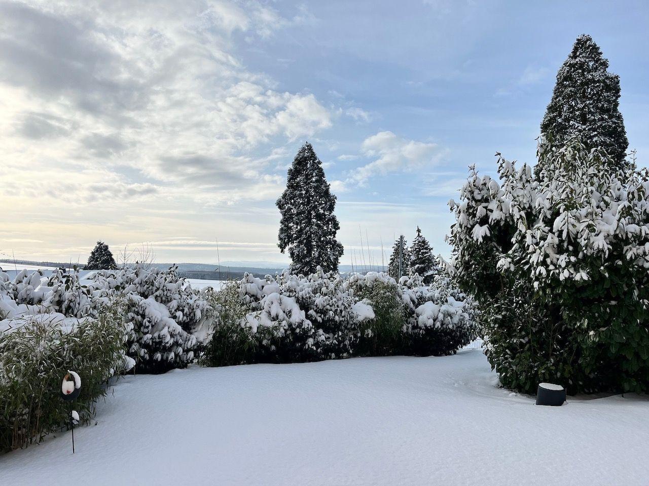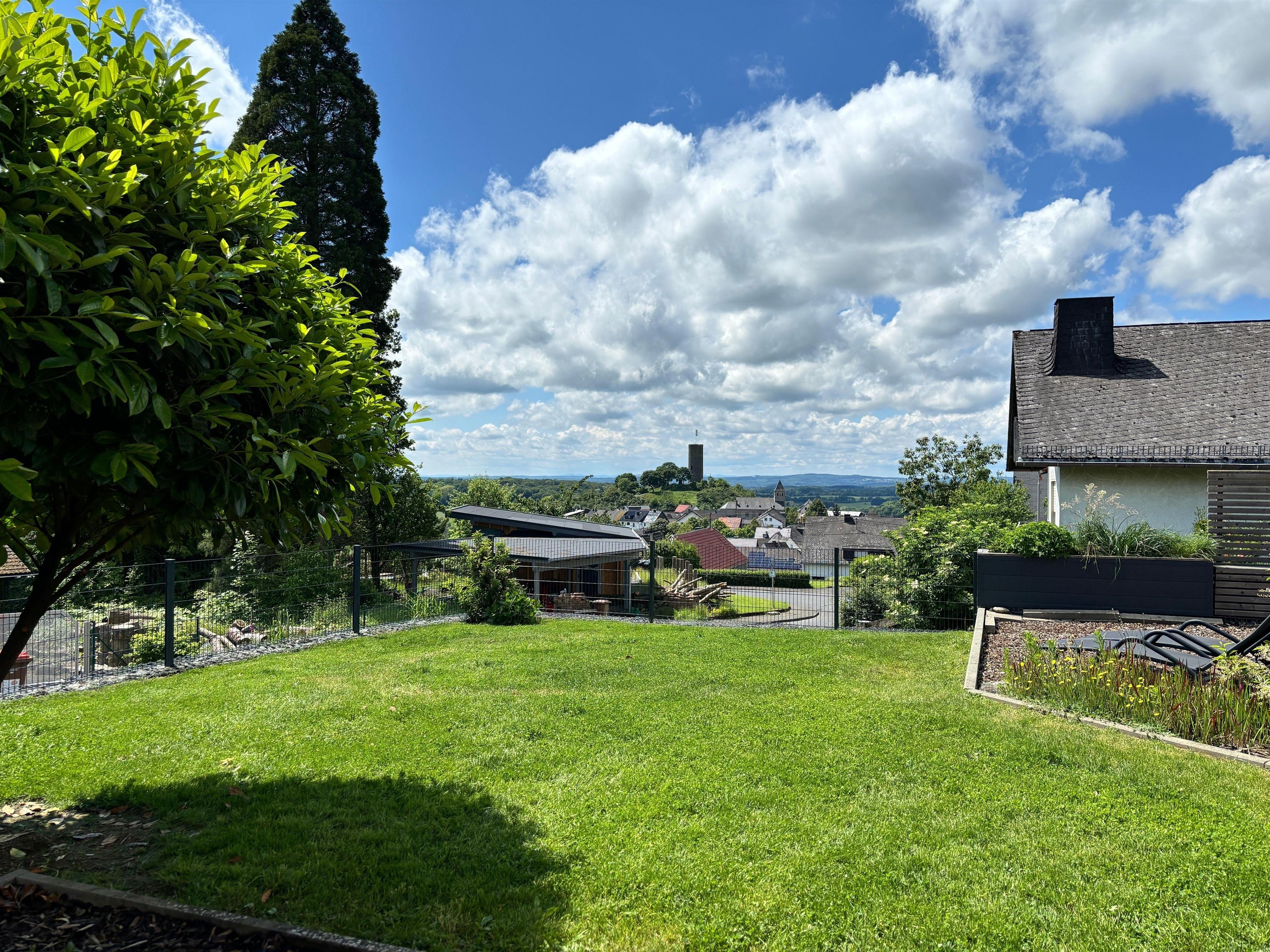 Die umlaufende Terrasse bietet sonnige und schattige Bereiche von Sonnenaufgang bis Sonnenuntergang. Die Terrasse ist mit einer Sitzgruppe, Sonnenschirmen und zwei Liegen ausgestattet. Der Blick nach Süden reicht bis zum 20 Km entfernten Aussichtsturm Köppel. Ein Panoramablick wird nur durch wenige Bäume unterbrochen. Der Garten ist hundefreundlich eingezäunt.