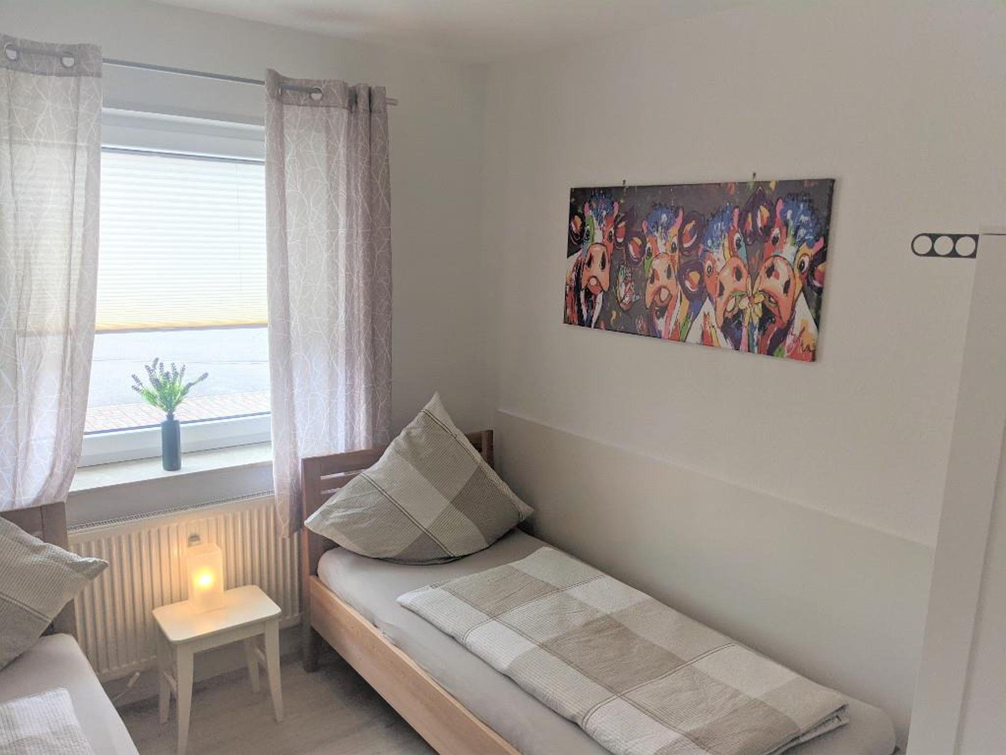 Helle, freundliche und sehr geräumige Wohnung. Offener Wohn- und Küchenbereich mit SAT-TV/Radio, Mikrowelle und 4 Plattenherd und gemütlicher Wohnlandschaft mit Schlafcouch, sep. Essbereich. Ein Schlafzimmer mit Boxspringbetten, Einzelbett und ein weiteres Schlafzimmer mit 2 Einzelbetten, exkl. Badausstattung mit Dusche und Badewanne, Waschbecken und WC. Die Wohnung hat eine Terasse und ist im EG. Kinderbett auf Wunsch möglich.