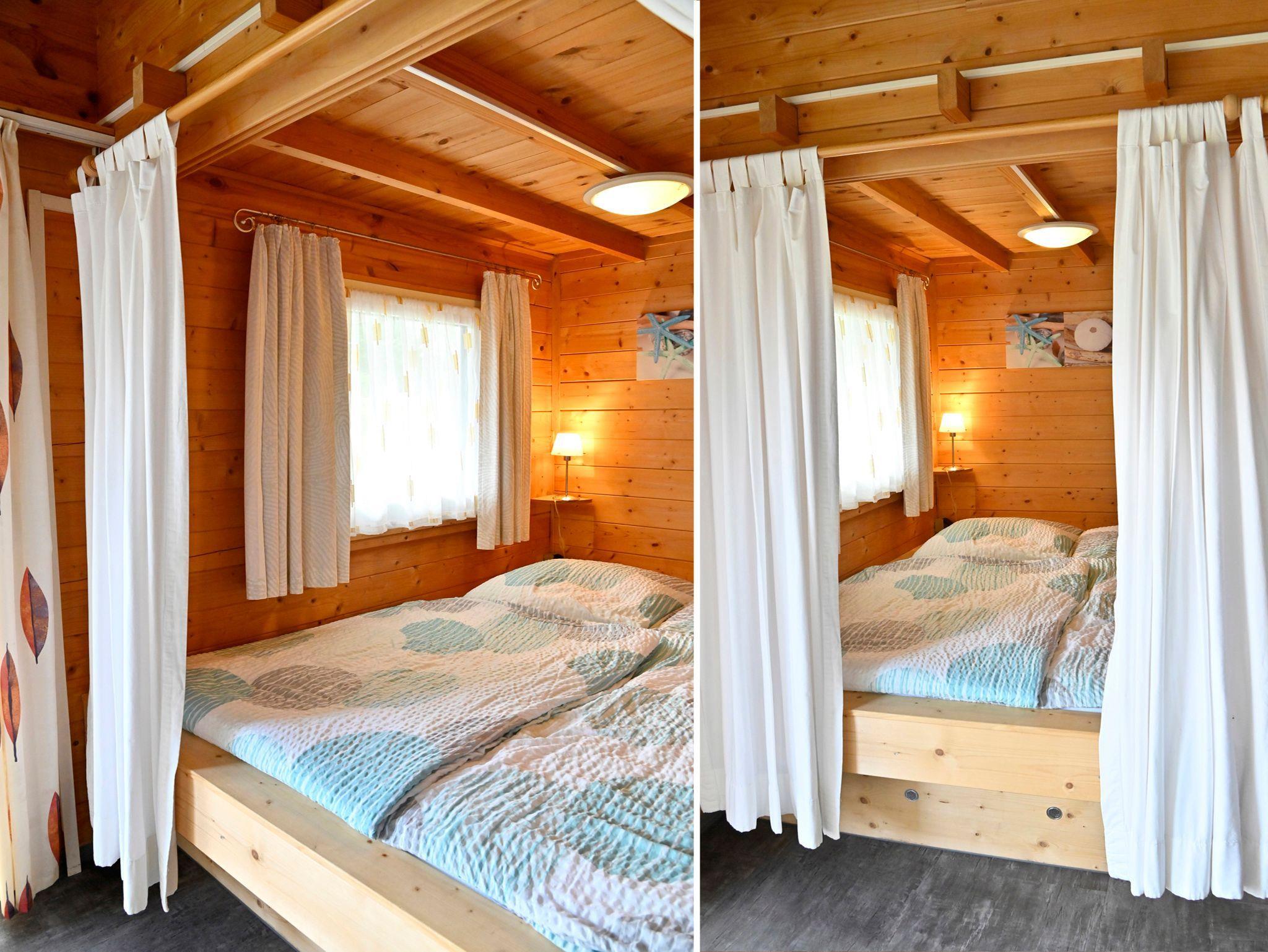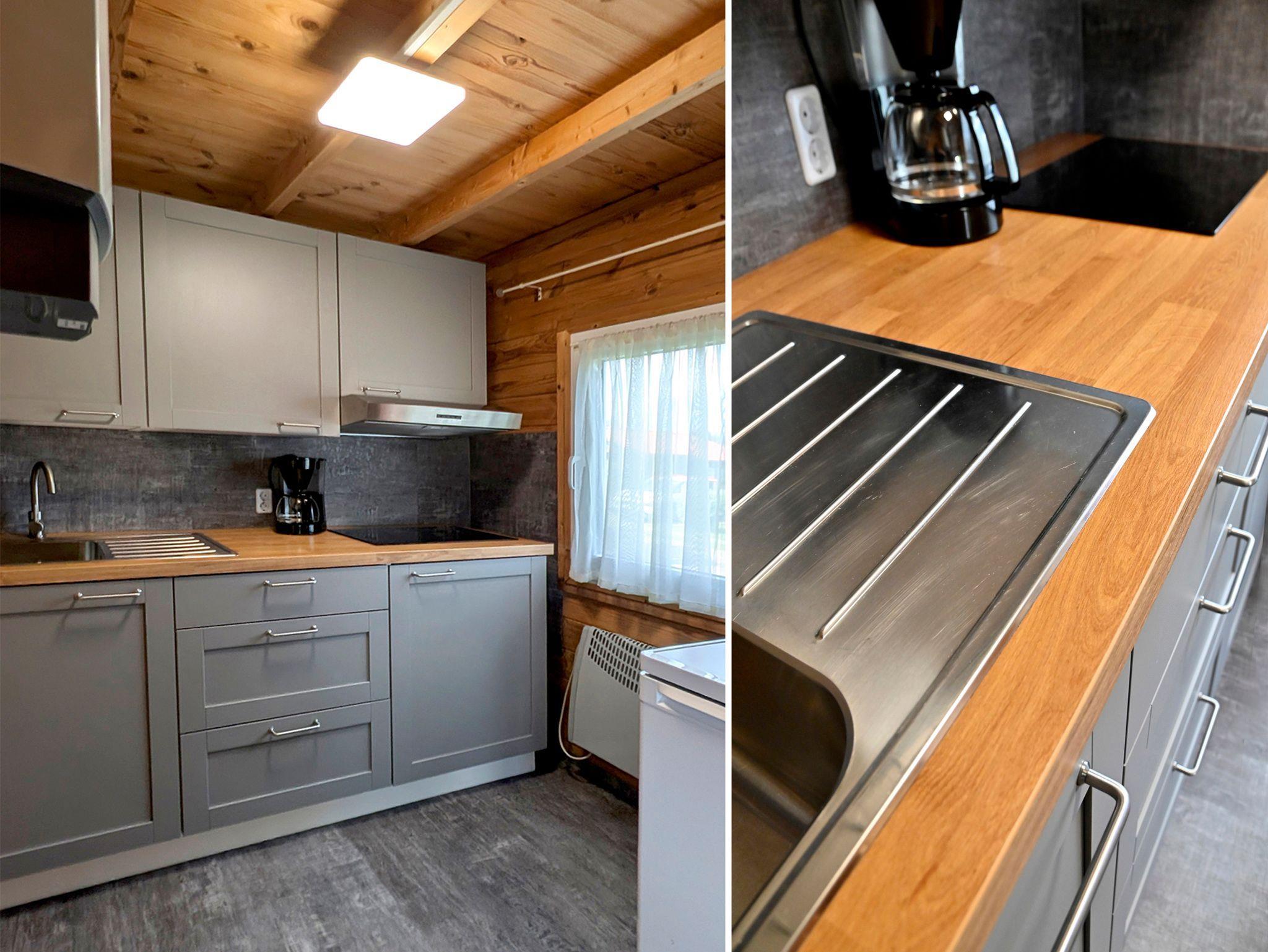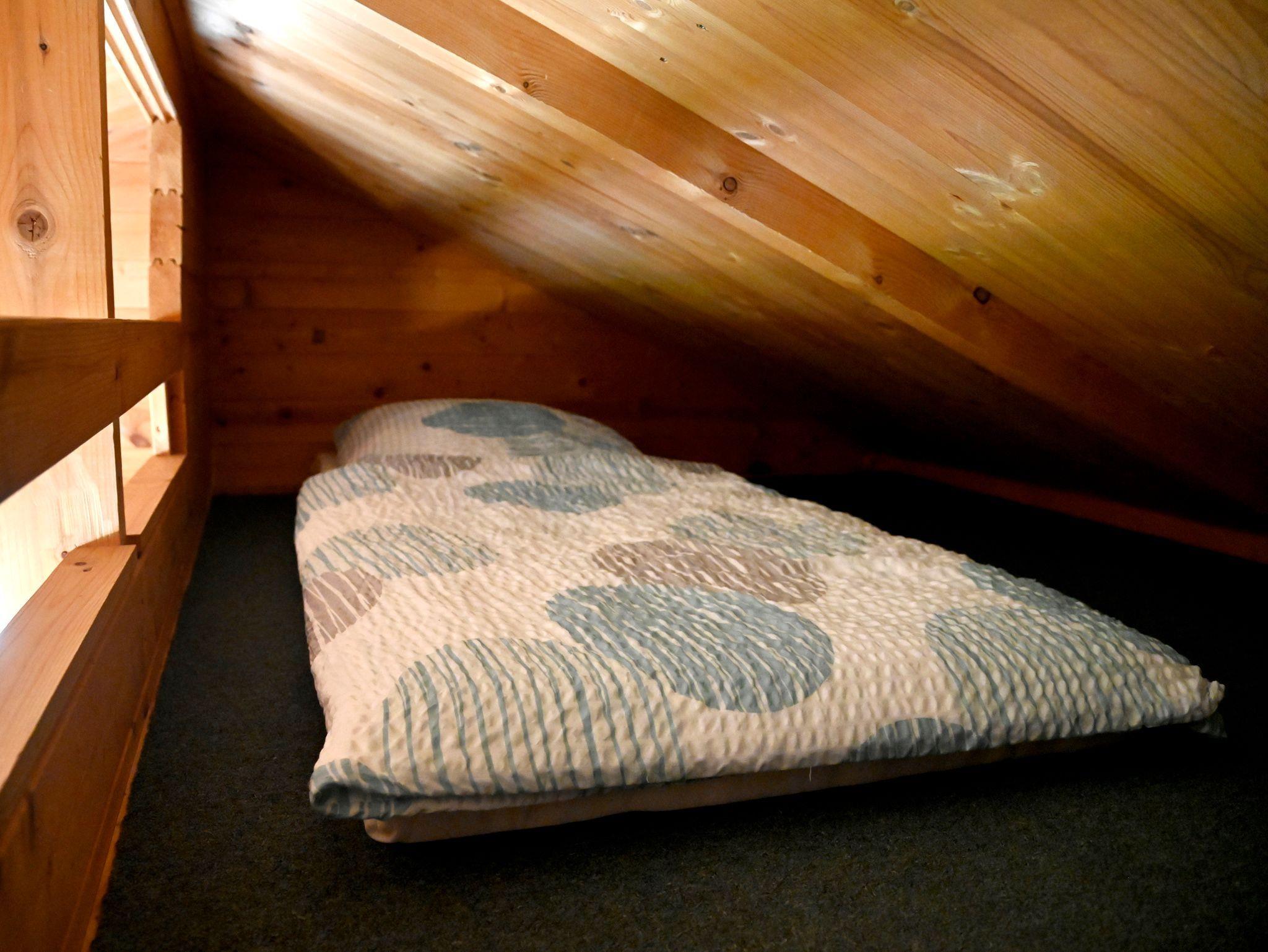 Küche mit Mikrowelle, Bad mit Dusche und WC, Wohnraum mit Schlafnische mit Doppelbett, SAT-TV, Radio, Sofa, 1 Schlafboden mit Aufleger über eine Leiter erreichbar, Außengrill, Parkmöglichkeit am Haus