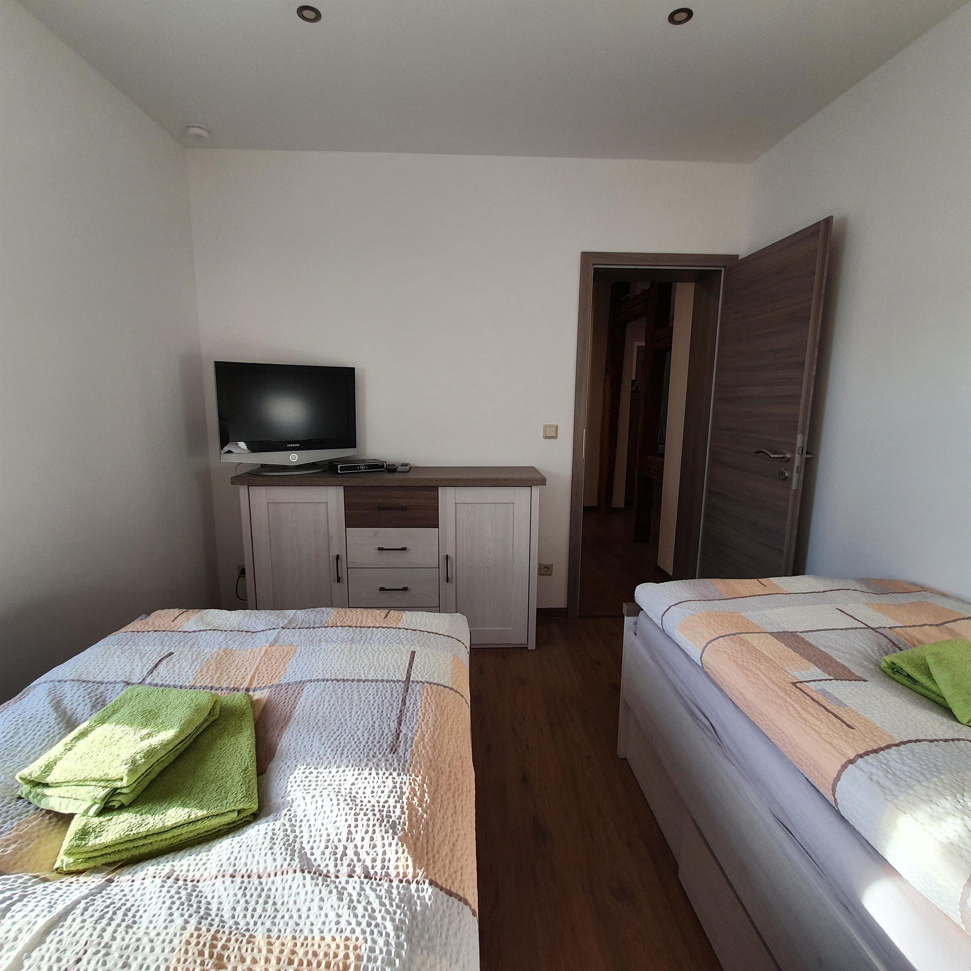 Schlafzimmer Nr. 1 ist ausgestattet mit 2 Einzelbetten, einer Kommode und einem Fernseher.