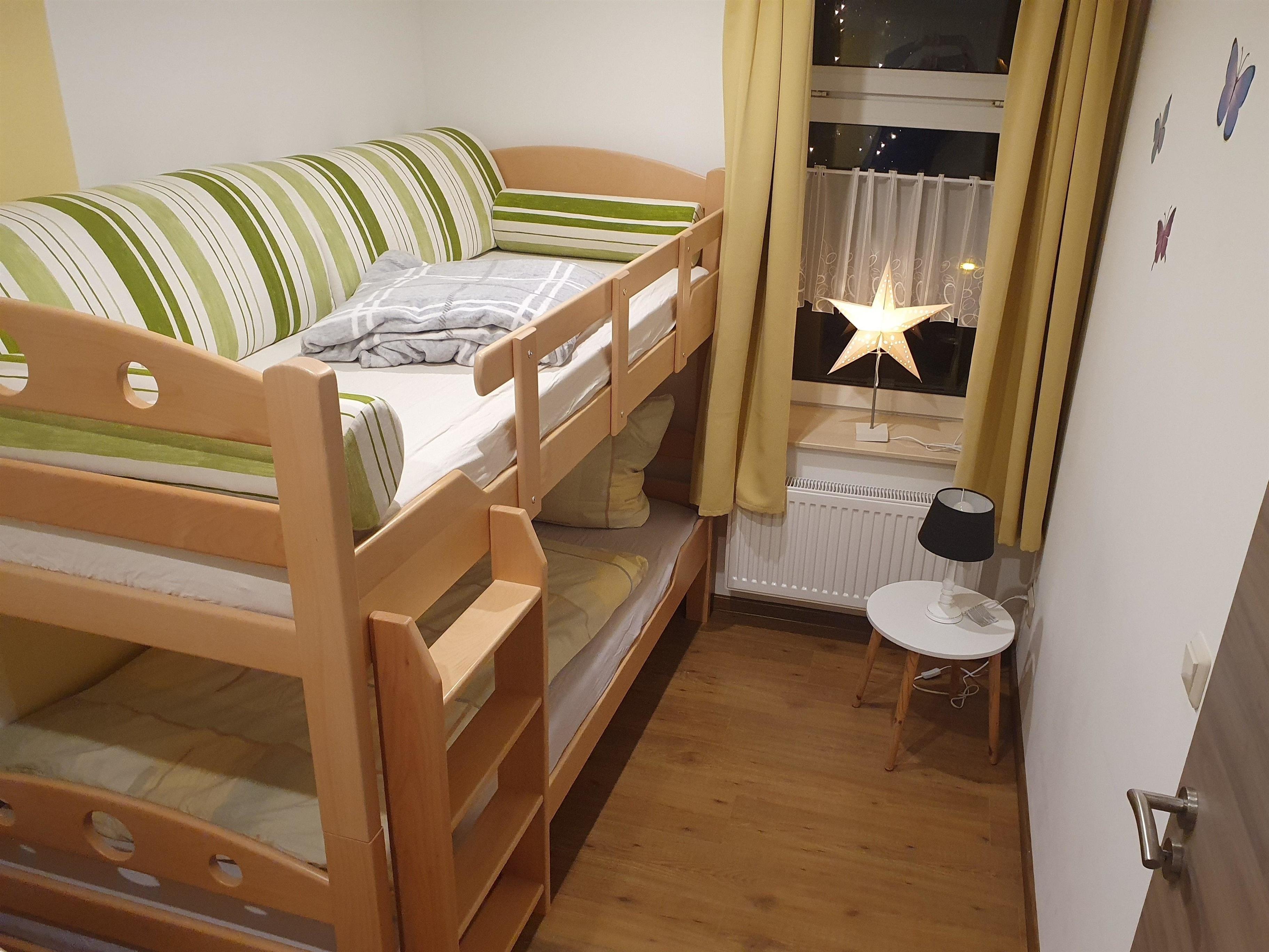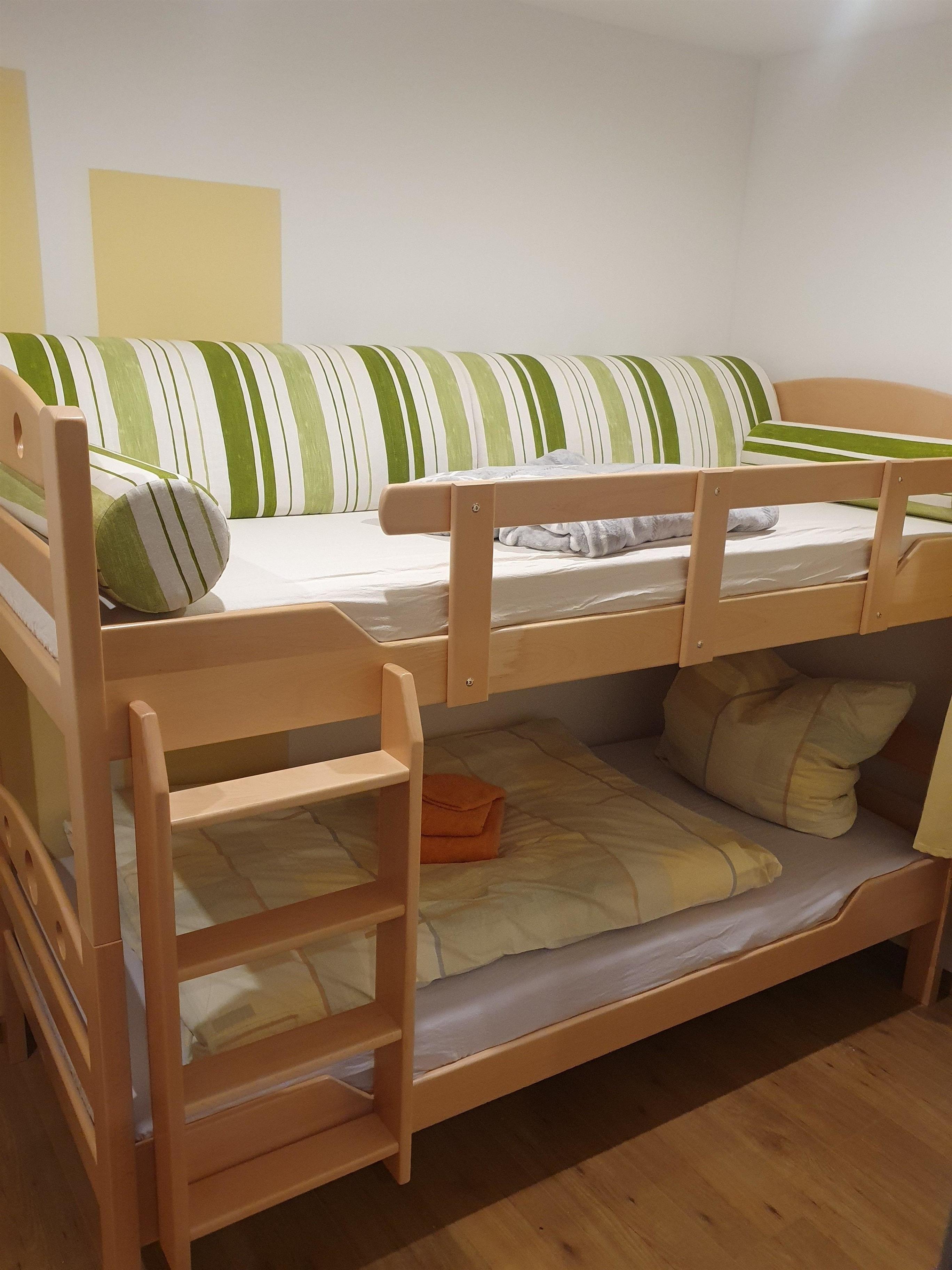 Das dritte Schlafzimmer ist ausgestattet mit Gitterbett, Babyfone und Doppelstockbett (auch für Erwachsene).