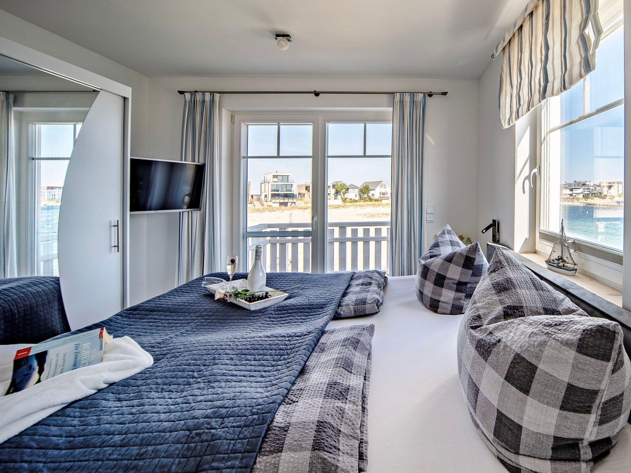 The white holiday house built in a Scandinavian style and flooded with daylight is at the end of the “Am Yachthafen” side street and right by the private beach that belongs to the six white beach villas with a total of 24 residential units. It is a beach house and really is right by the beach, just 10 metres from the terrace, right up to the site.