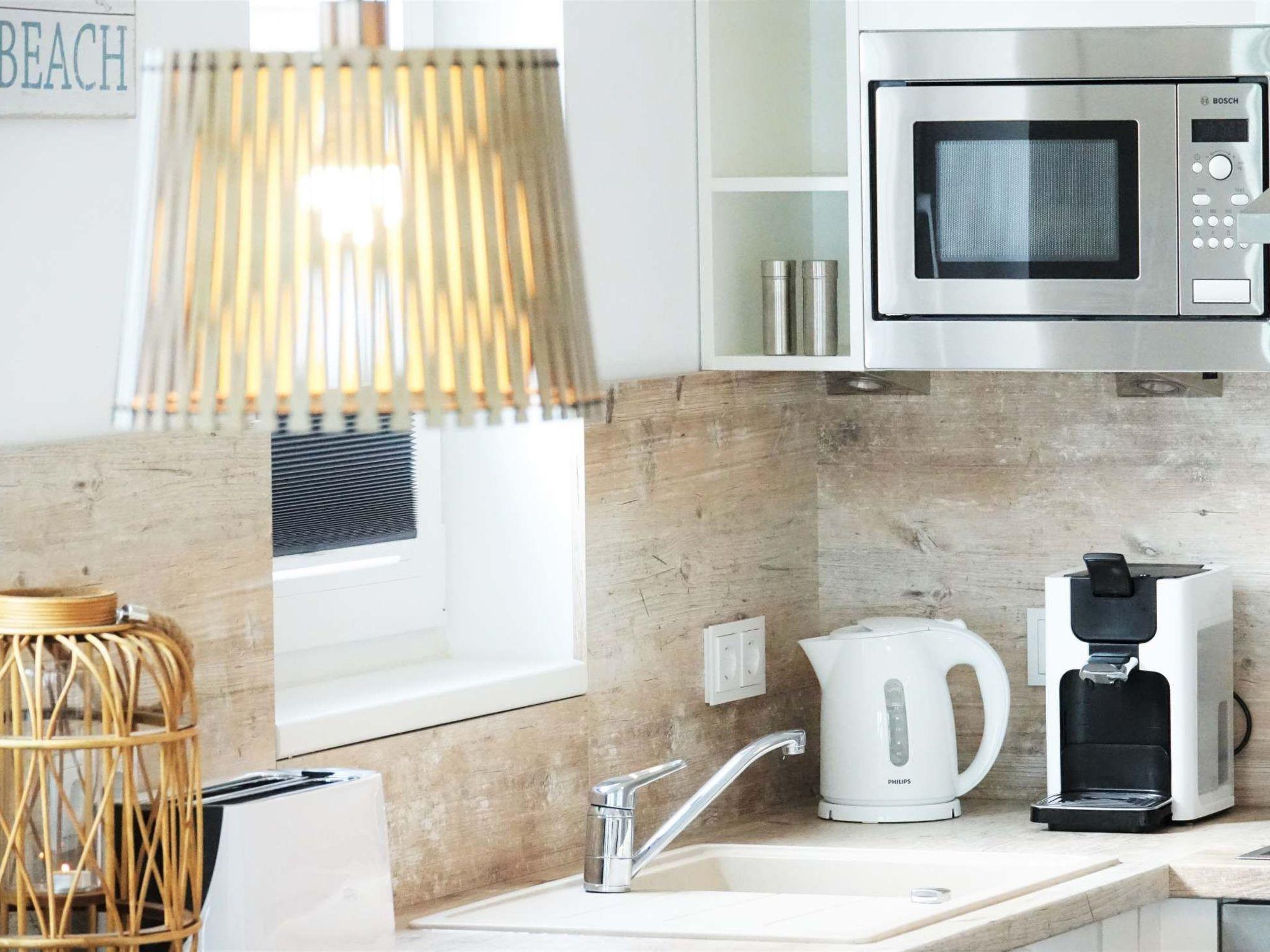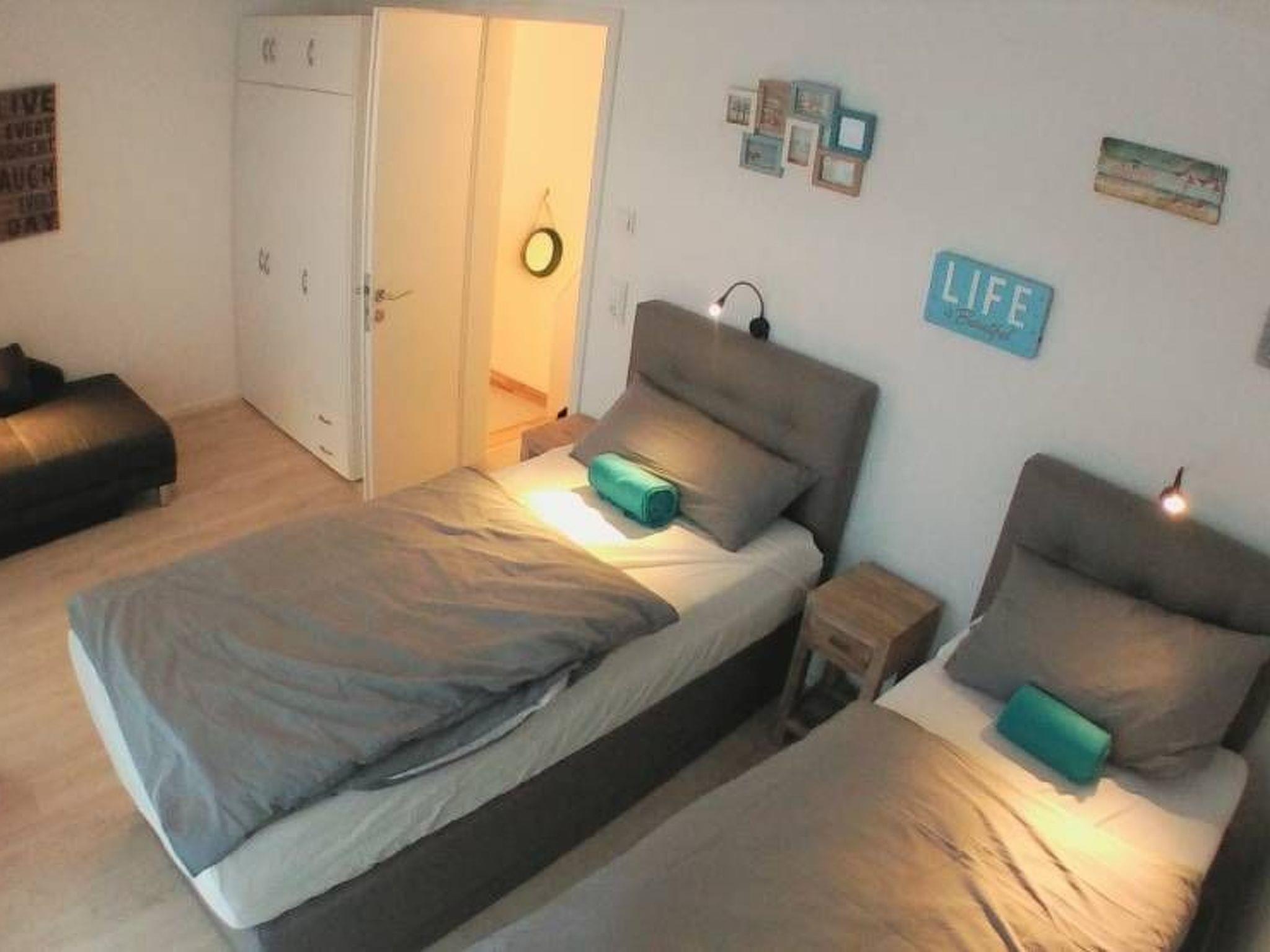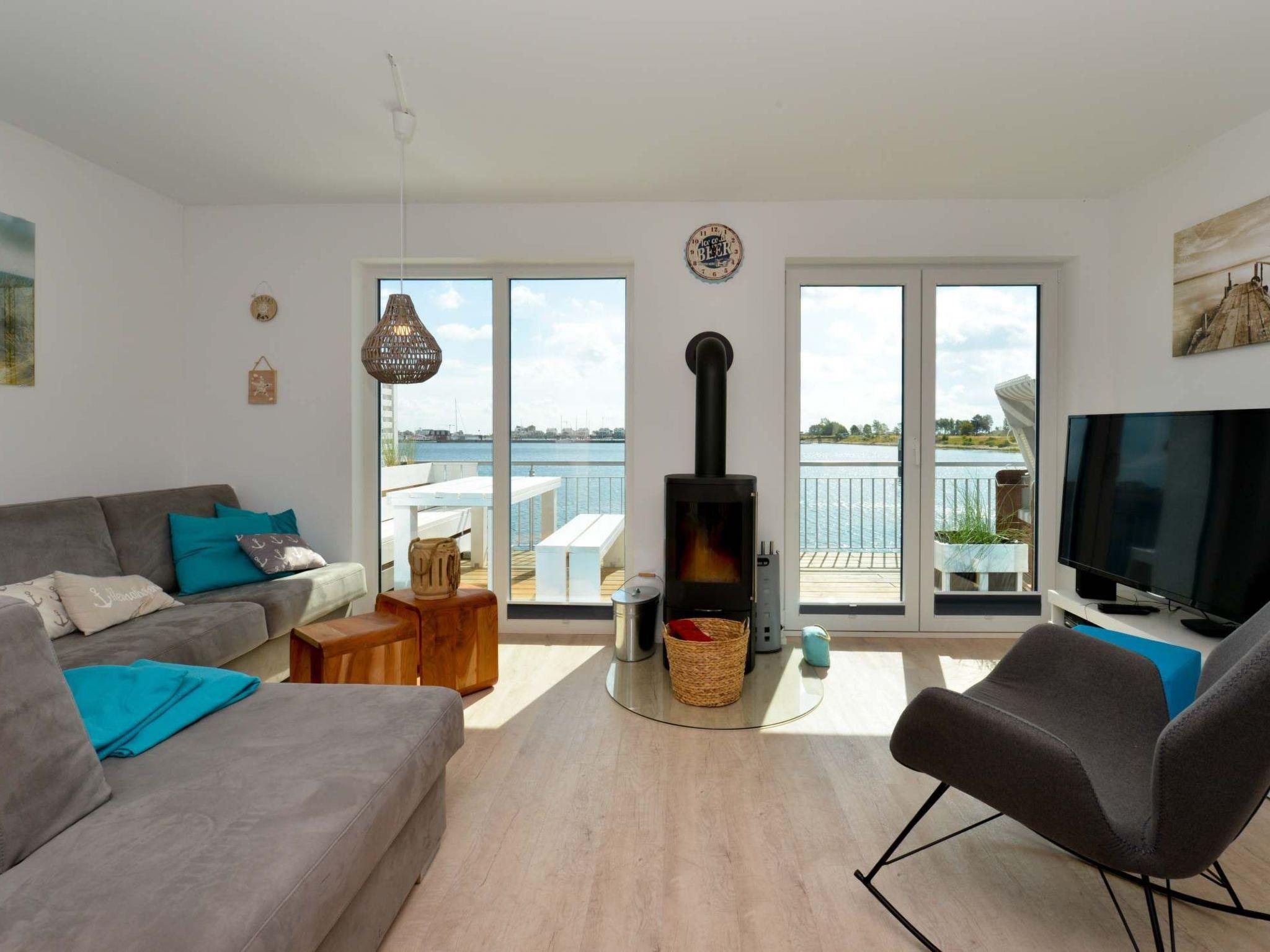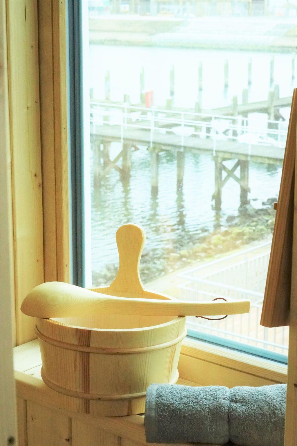 The beautiful wellness bathroom with shower, whirlpool bath, sauna and WC makes your holiday an experience even in bad weather. A further bathroom with shower and WC makes bathroom time easier for families. For the bad days there is also a nice fireplace (please bring your own wood), a Playstation PS4 pro, a few board games, DVDs and books. A beautiful bedroom with direct sea view and spacious box spring bed (1 double bed 180*200cm) offer a relaxed and restful sleep. The second bedroom has 2 single box-spring beds (90x200) and a sofa bed, here you can also see the water. A baby travel cot is available. A very comfortable sofa bed in the living room (sleeping area 150x200cm) is suitable for 2 more guests and you wake up with a direct view of the water. The holiday home has underfloor heating and elegant, white double-glazed plastic windows with blackout blinds in the bedrooms and living room.