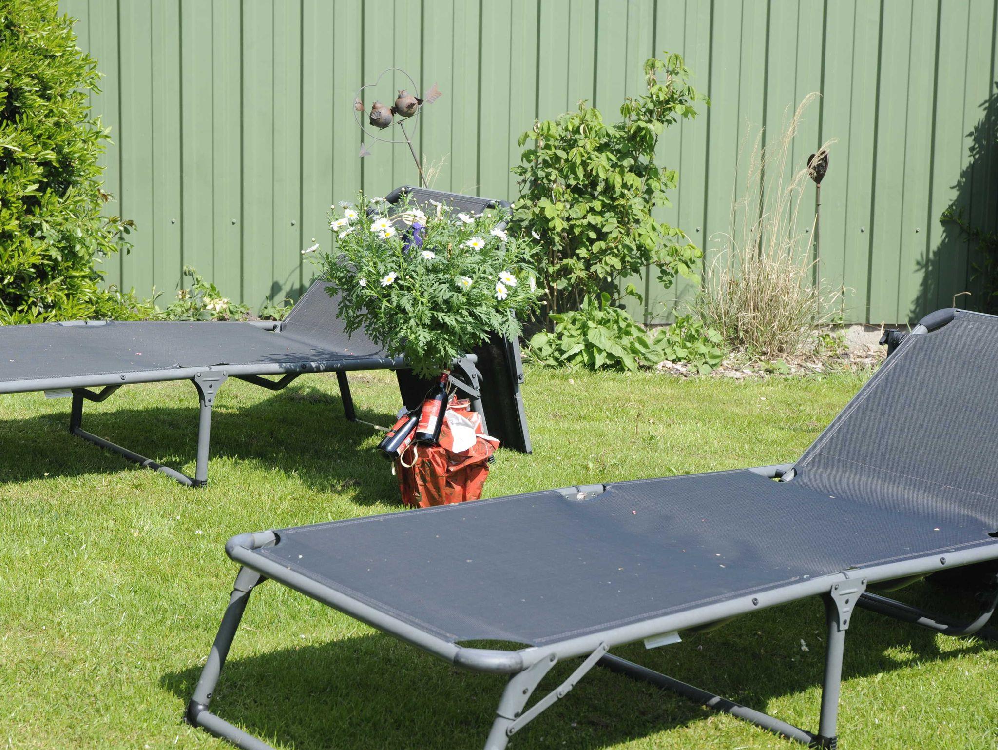 • Garten mit Sitzgruppe, Sonnenliegen, Kinderspielgeräten und Gartenhaus mit Grillterrasse