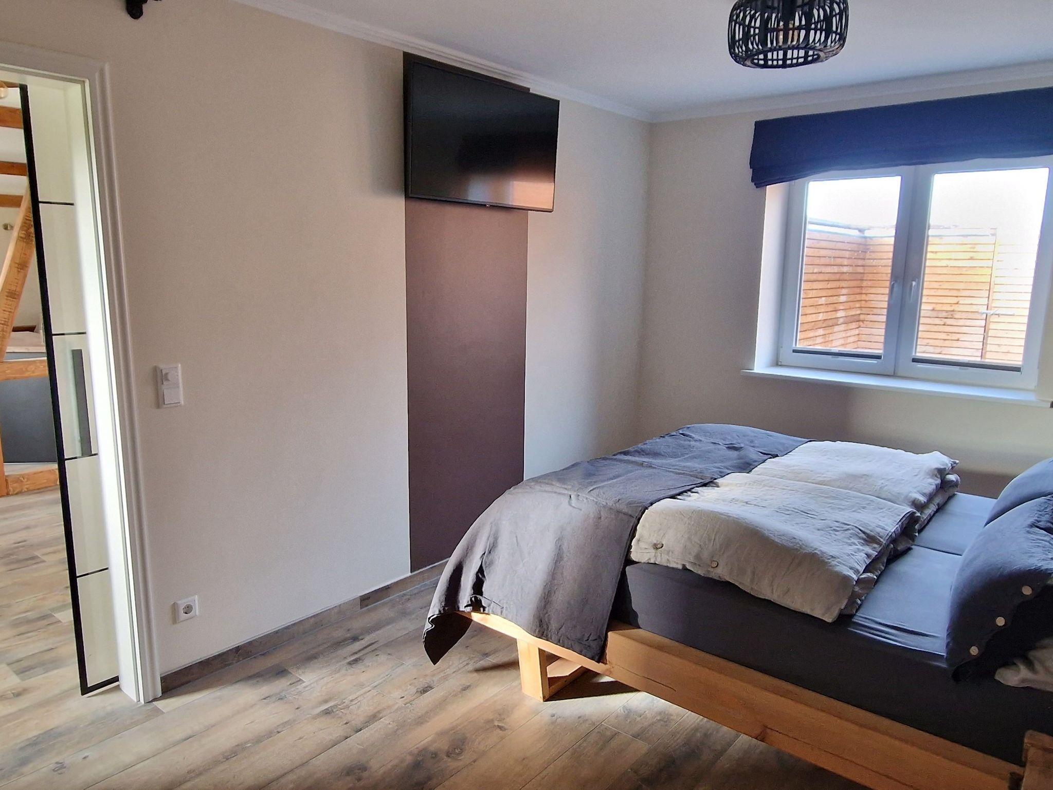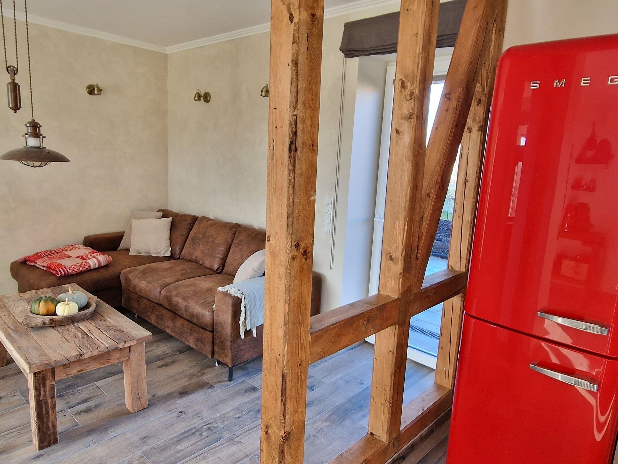 Die Ferienwohnung Klüterkammer im Anbau des ehemaligen Backhauses des Hofes ist in einem charmanten Mix aus Alt und Modern gestaltet und hochwertig ausgestattet. Eine Fußbodenheizung sorgt für angenehme Wärme.
