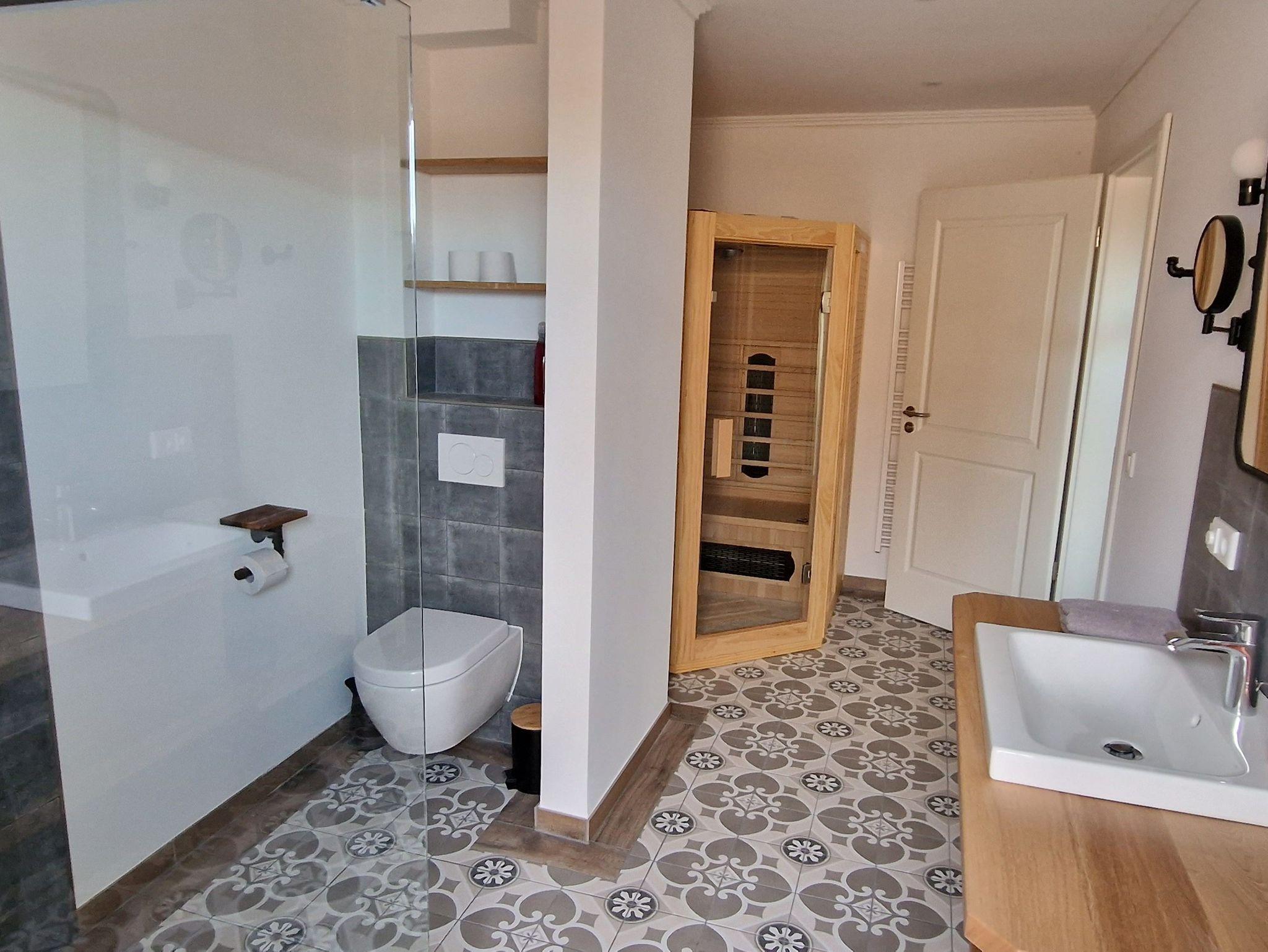 - Duschbad mit ebenerdiger Regendusche, Handtuchheizkörper, Waschtrockner und Infrarotkabine; Handtücher