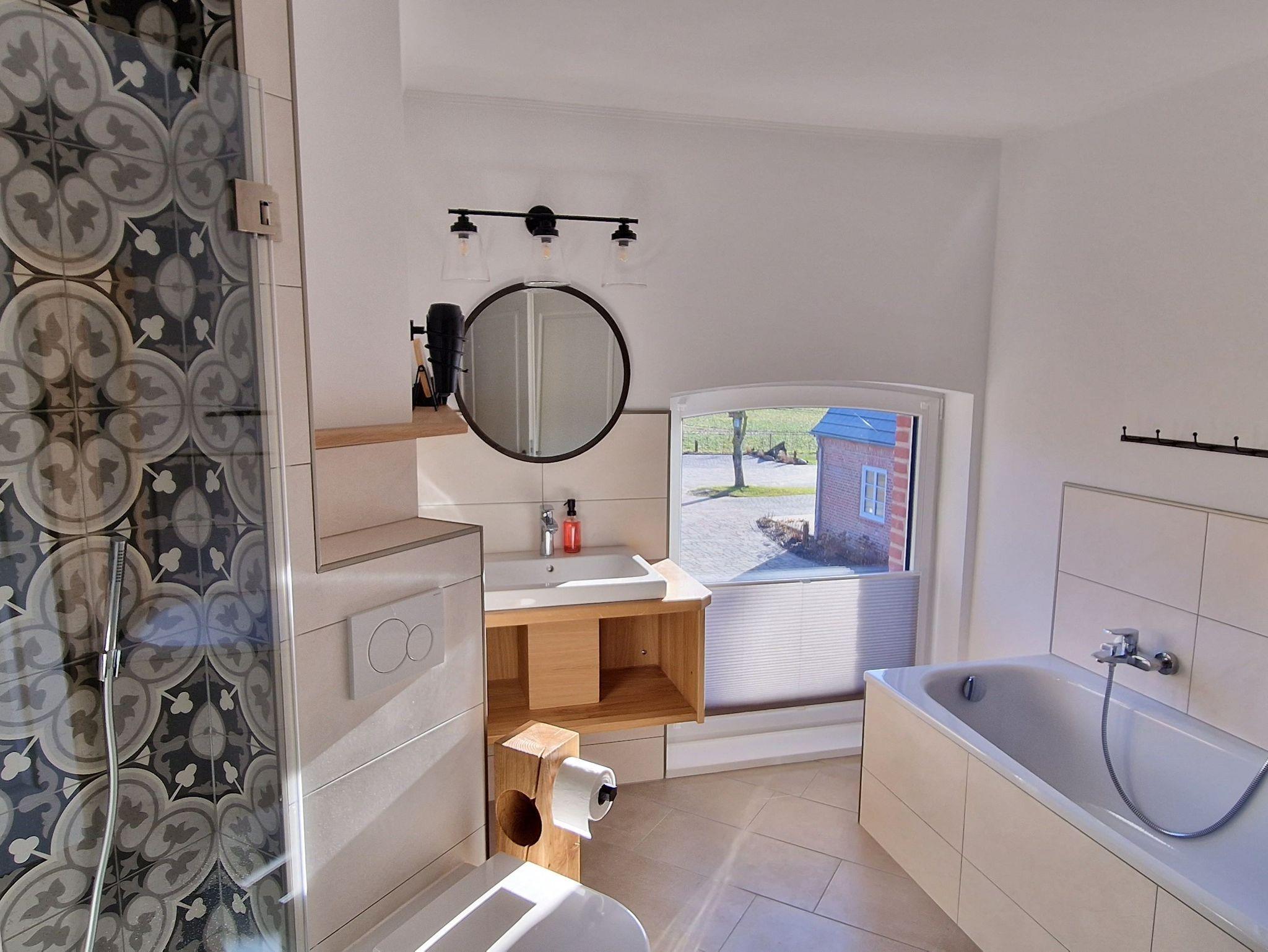 - Bad mit Wanne, ebenerdiger Regendusche, Handtuchheizkörper und Infrarotkabine; Handtücher