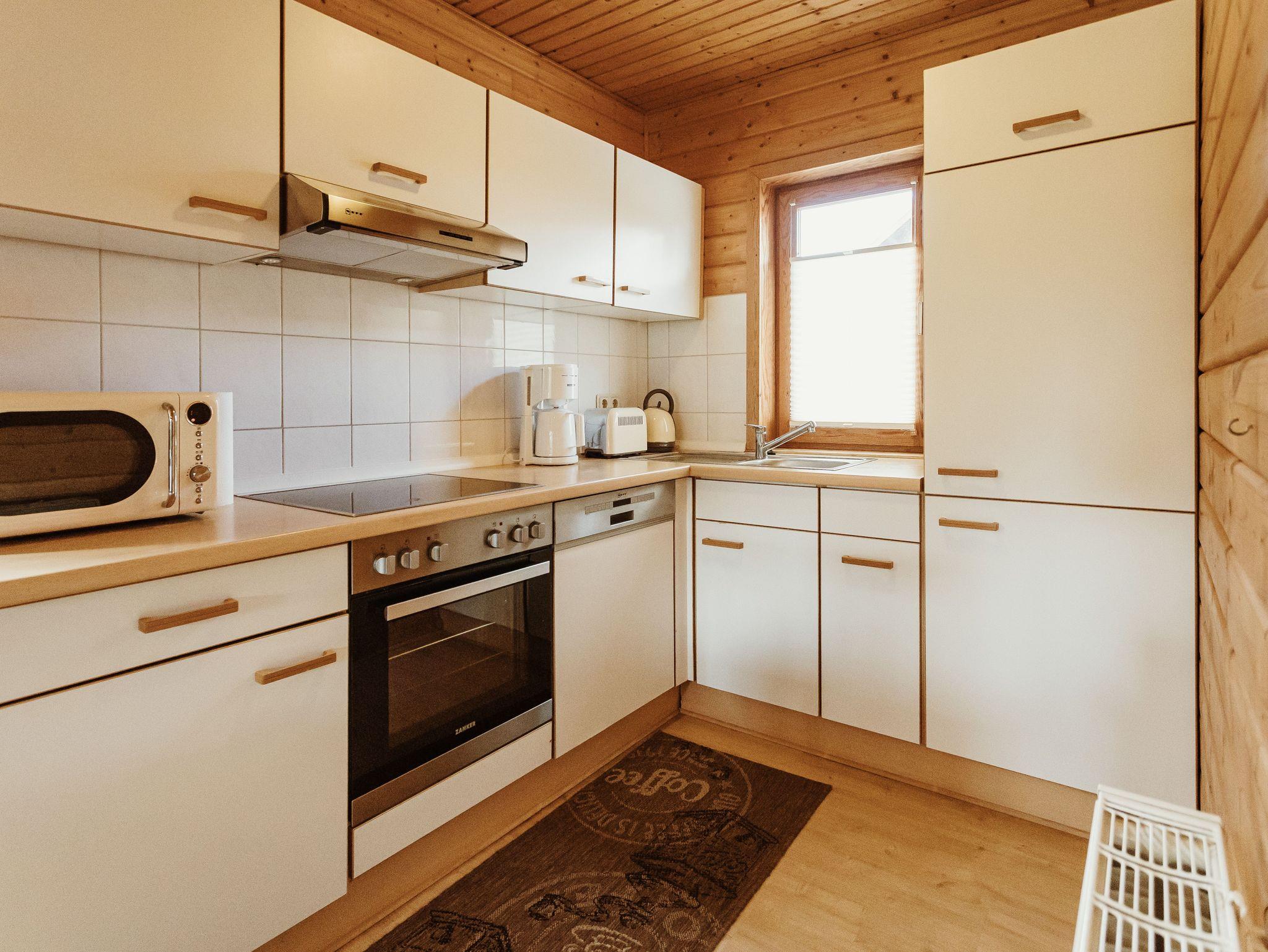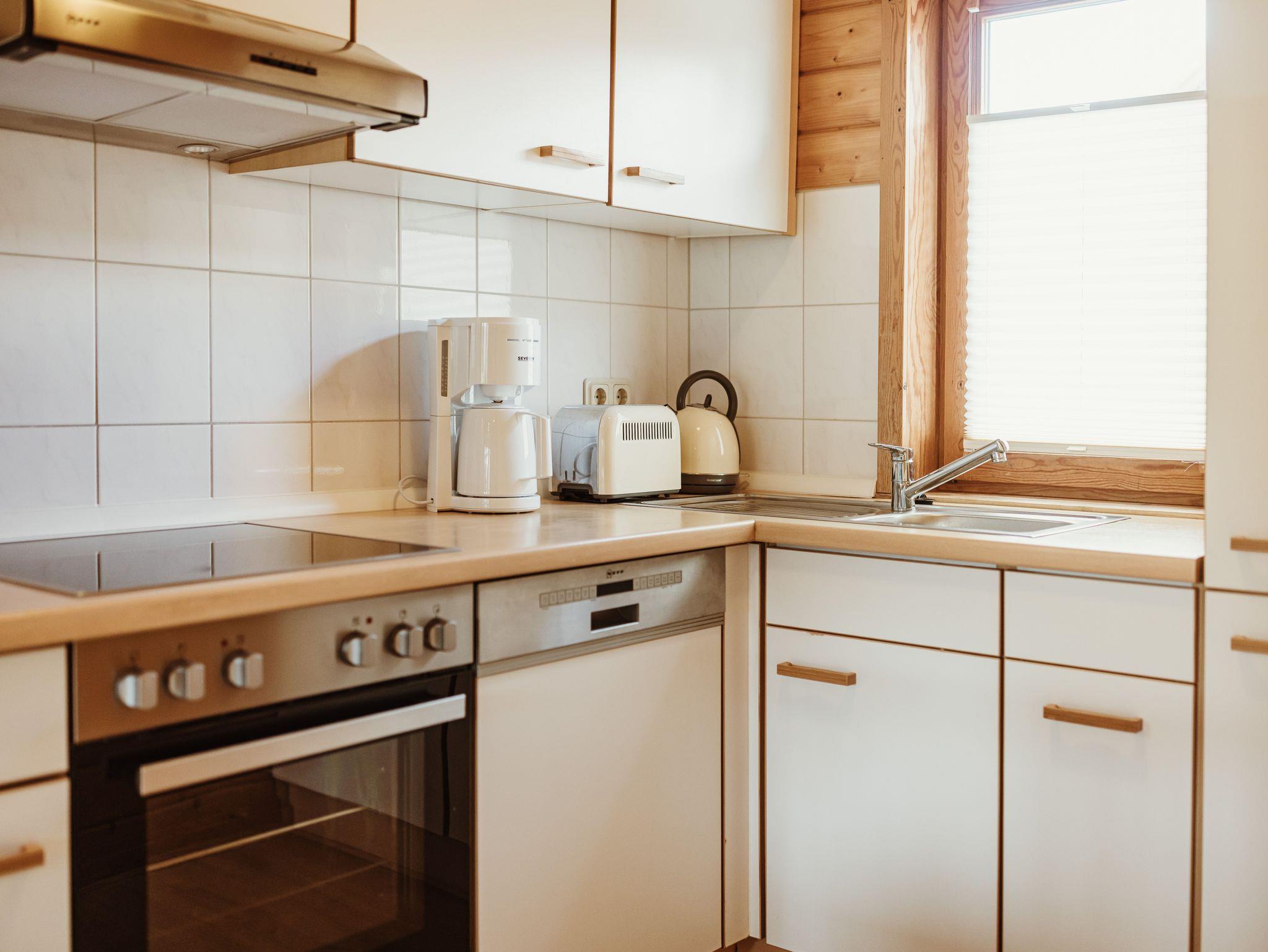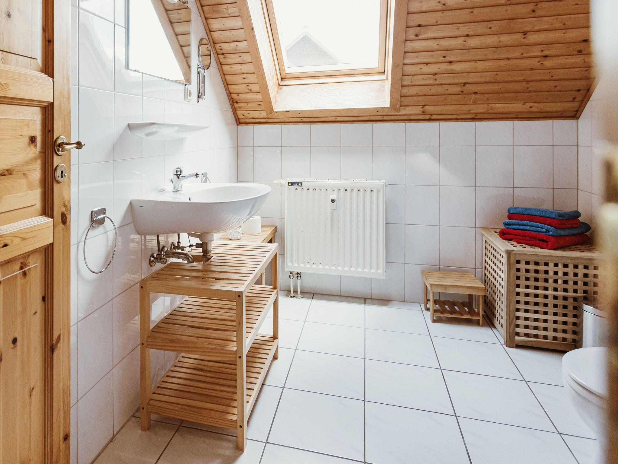 Im Erdgeschoss befinden sich ein Wohnbereich mit Schlafcouch für zwei Personen, eine geräumige Essecke sowie eine vollständig ausgestattete Küche mit Cerankochfeld, Backofen (Umluft), Mikrowelle, Toaster, Kaffeemaschinen (Filter, Senseo, Dolce Gusto), Wasserkocher, Spülmaschine und Geschirr. Ergänzt wird die Etage durch ein Gäste-WC mit Waschbecken.