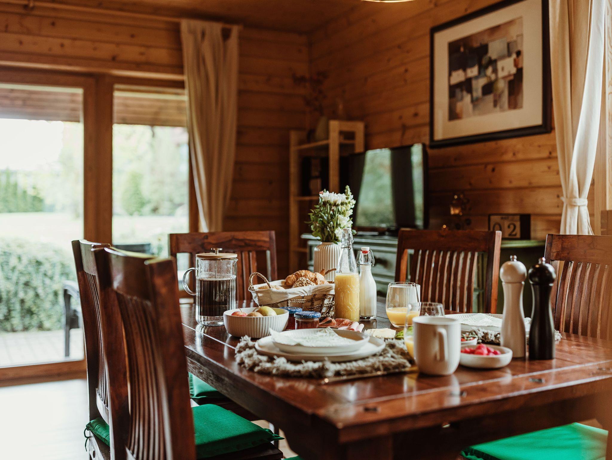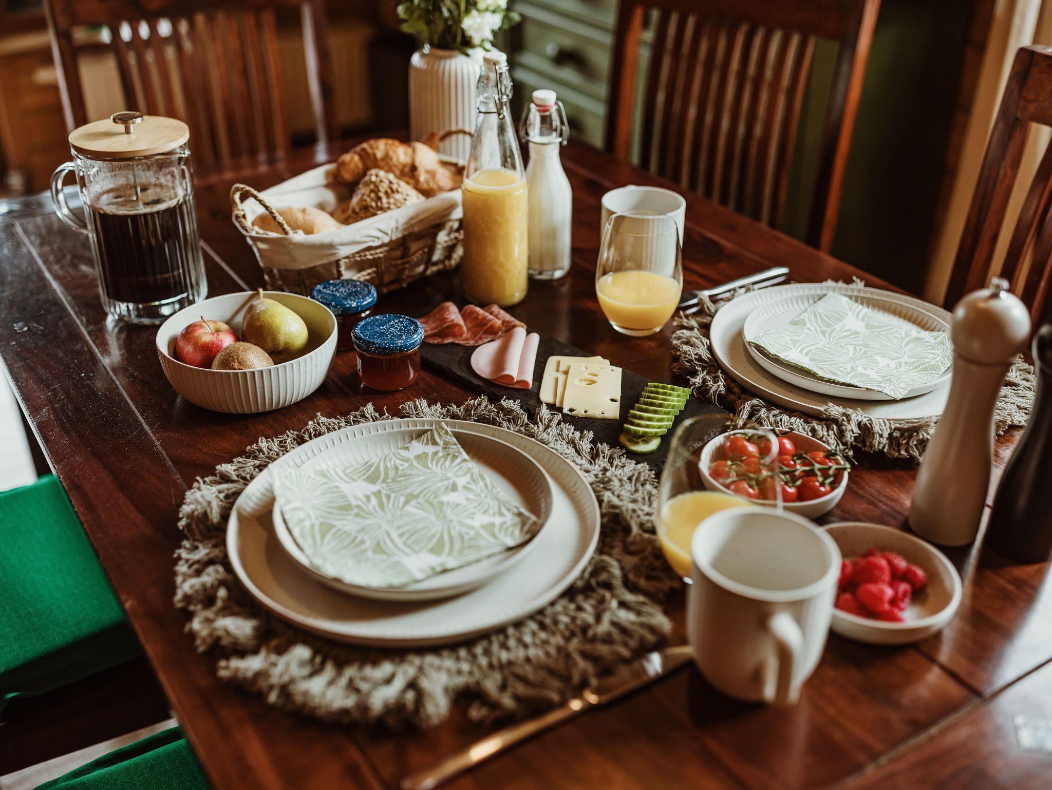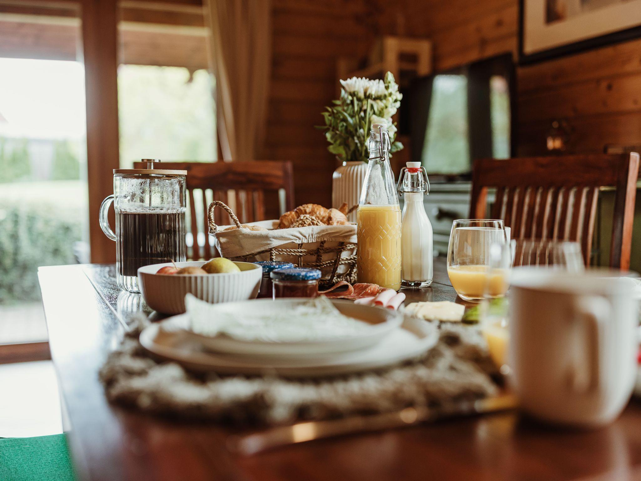 Im Erdgeschoss befinden sich ein Wohnbereich mit Schlafcouch für zwei Personen, eine geräumige Essecke sowie eine vollständig ausgestattete Küche mit Cerankochfeld, Backofen (Umluft), Mikrowelle, Toaster, Kaffeemaschinen (Filter, Senseo, Dolce Gusto), Wasserkocher, Spülmaschine und Geschirr. Ergänzt wird die Etage durch ein Gäste-WC mit Waschbecken.
