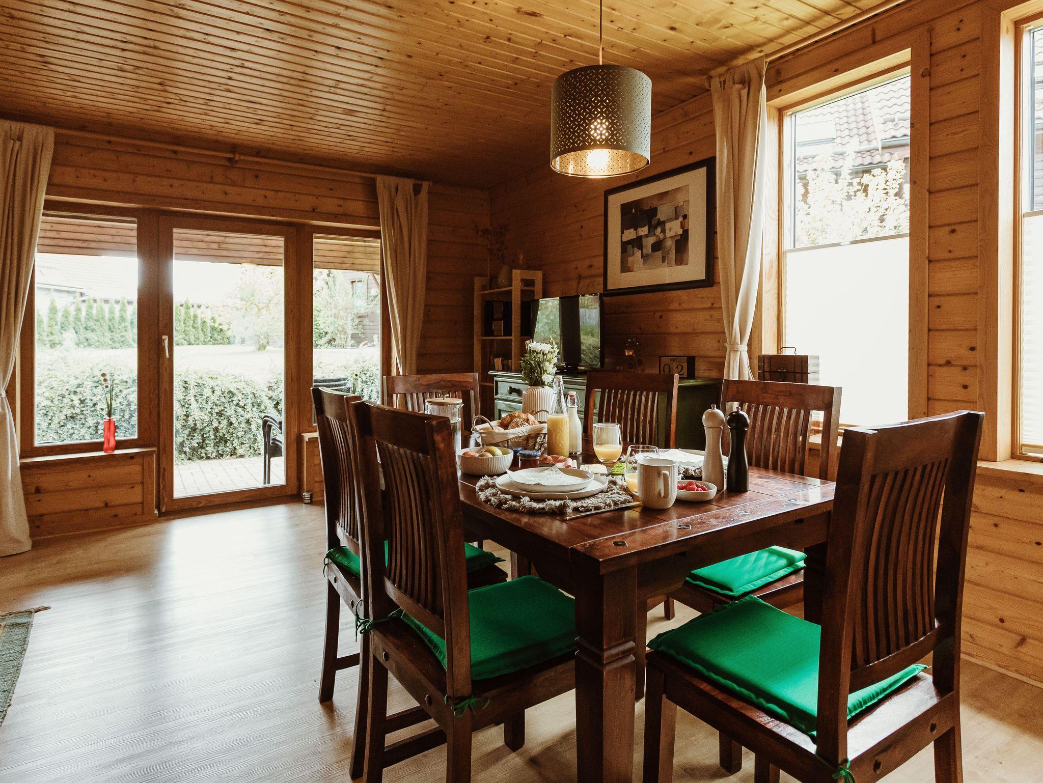 Die Doppelhaushälfte in Holzbauweise bietet auf rund 65 m² Platz für bis zu sechs Personen und ist von einer großzügigen Rasenfläche umgeben.