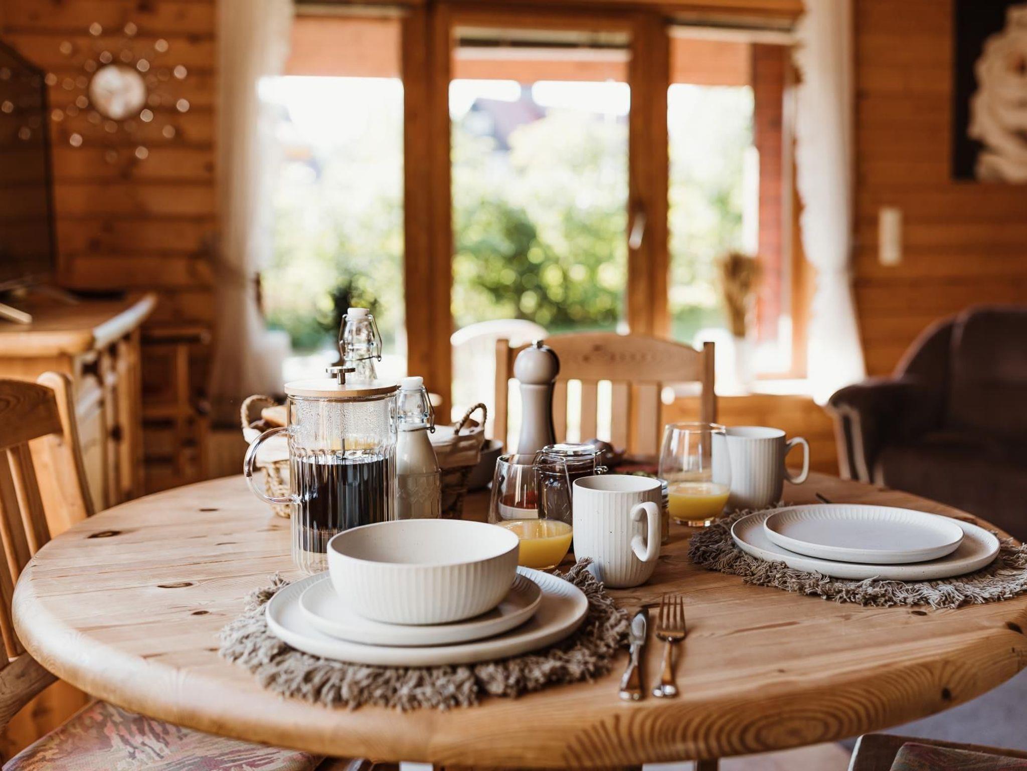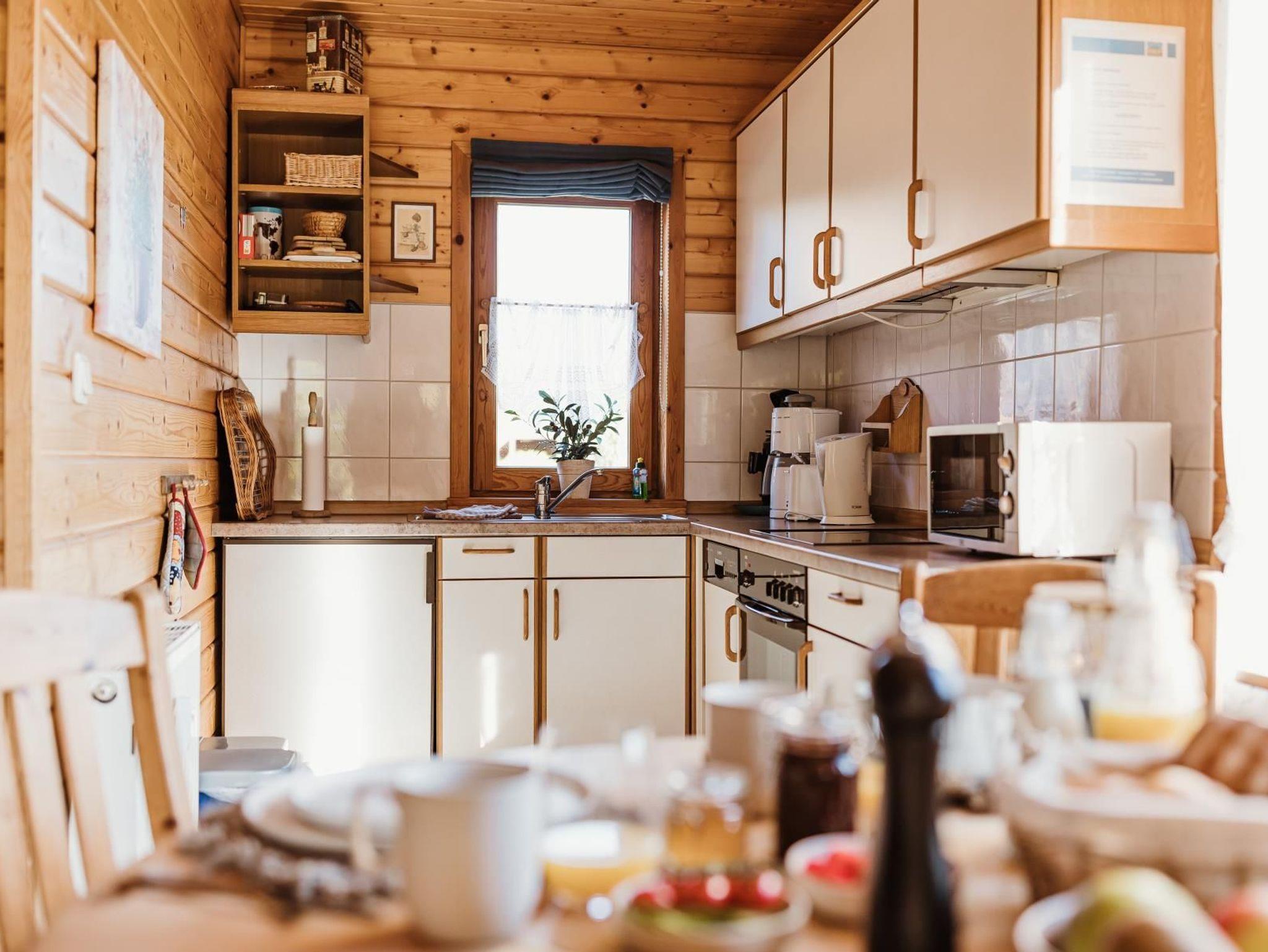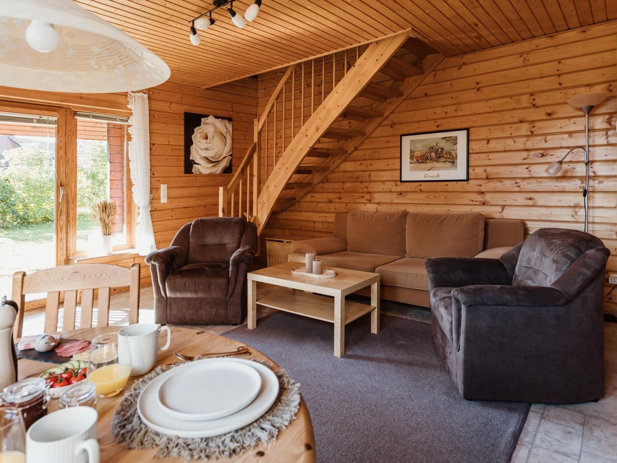Die Doppelhaushälfte in Holzbauweise verfügt über drei Zimmer auf rund 65 m² Wohnfläche und bietet Platz für bis zu sechs Personen. Im Erdgeschoss befindet sich ein großzügiger Wohnbereich mit Schlafcouch, separatem Essplatz, SAT-TV mit Sky, voll ausgestatteter Küchenzeile, Abstellraum und Gäste-WC. WLAN steht kostenfrei zur Verfügung, ebenso ein Kinderhochstuhl.