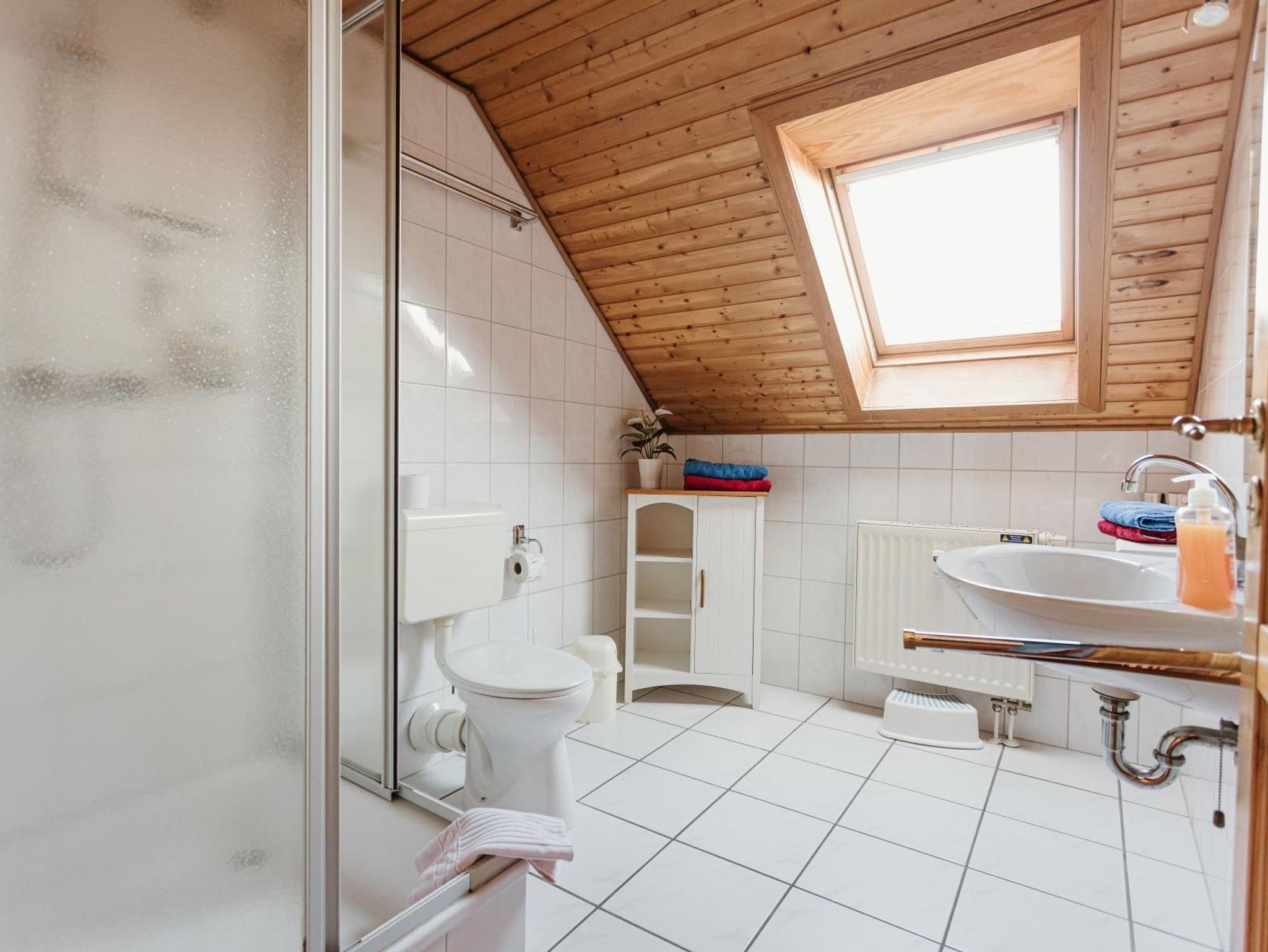 Im Dachgeschoss liegen zwei Schlafzimmer ? eines mit getrennten Betten, das andere mit einem Boxspringbett (180 x 200 cm). Bei eigener Bettwäsche ist ein entsprechend großes Laken mitzubringen. Ergänzt wird die Etage durch ein Duschbad/WC.