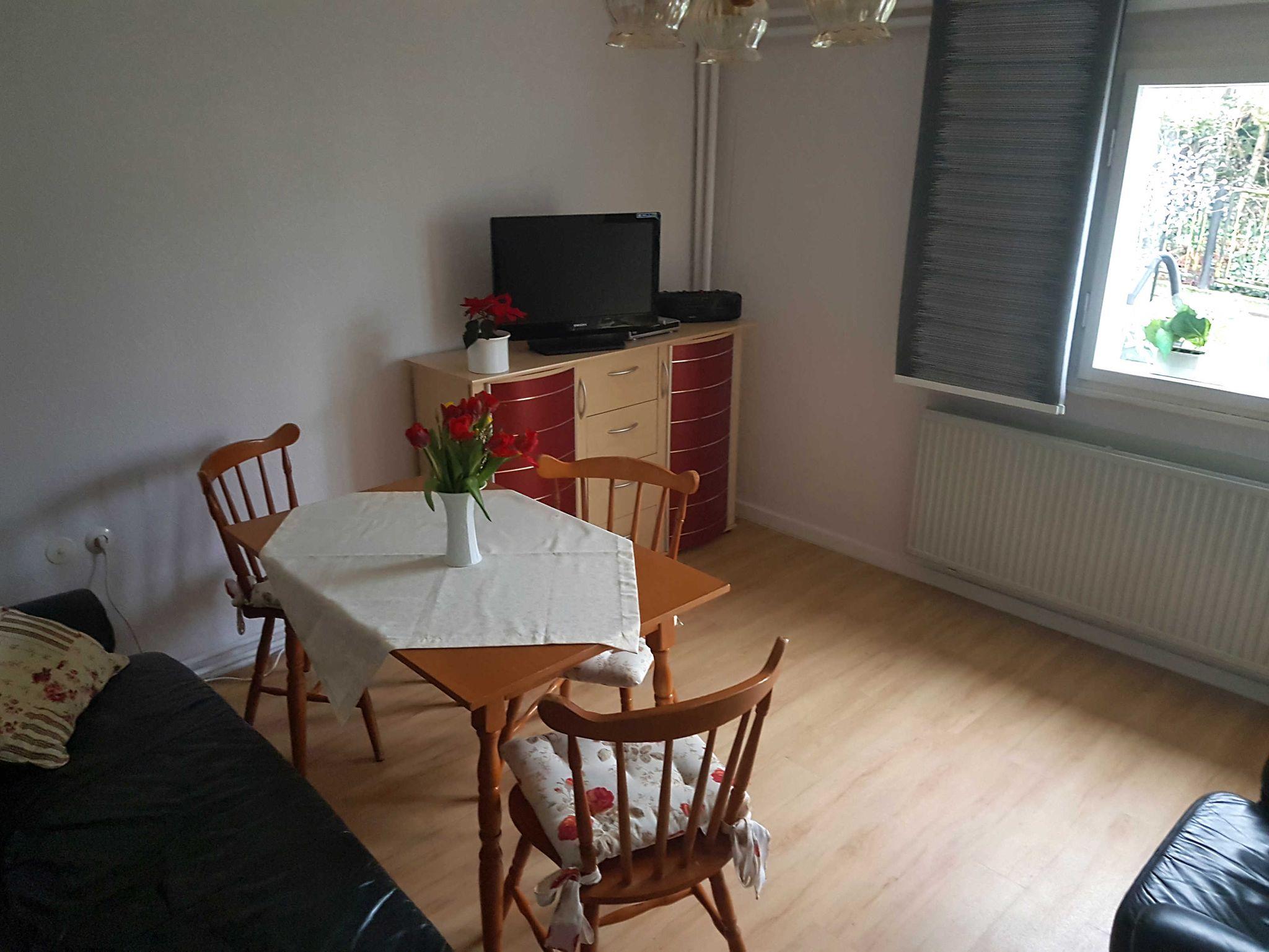 Das Wohnzimmer ist zweckentsprechend eingerichtet. Zusätzlich zum Sessel und einem Sofa befindet sich in der Mitte des Raumes ein Tisch mit 3 Stühlen, wo gemütlich selbst gefertigte Mahlzeiten eingenommen werden können. Die kleine Kochnische mit einer Koch- und Kühlkombination und integrierter Spüle sorgt für eine ausreichende Selbstversorgung. Kaffeemaschine und Toaster sind vorhanden. Am Ende eines schönen Urlaubstages sorgen das Fernsehgerät mit Satellitenempfang und Radio für Information und Unterhaltung.