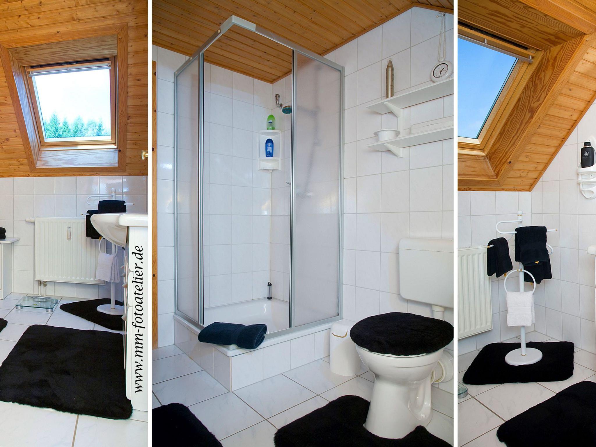 Im Obergeschoss befinden sich ein Schlafzimmer mit Doppelbett und ein Schlafzimmer mit zwei getrennten Betten sowie ein Bad mit Dusche und WC. Ein Föhn und ein Haarglätter stehen zur Verfügung. Für Kleinkinder sind ein Reisebett und eine Wickelauflage vorhanden. Beide Schlafzimmer verfügen über Verdunkelungsrollos, Sitzgelegenheit, TV und CD-/Stereo-Anlage. Ein Safe ist ebenfalls vorhanden.