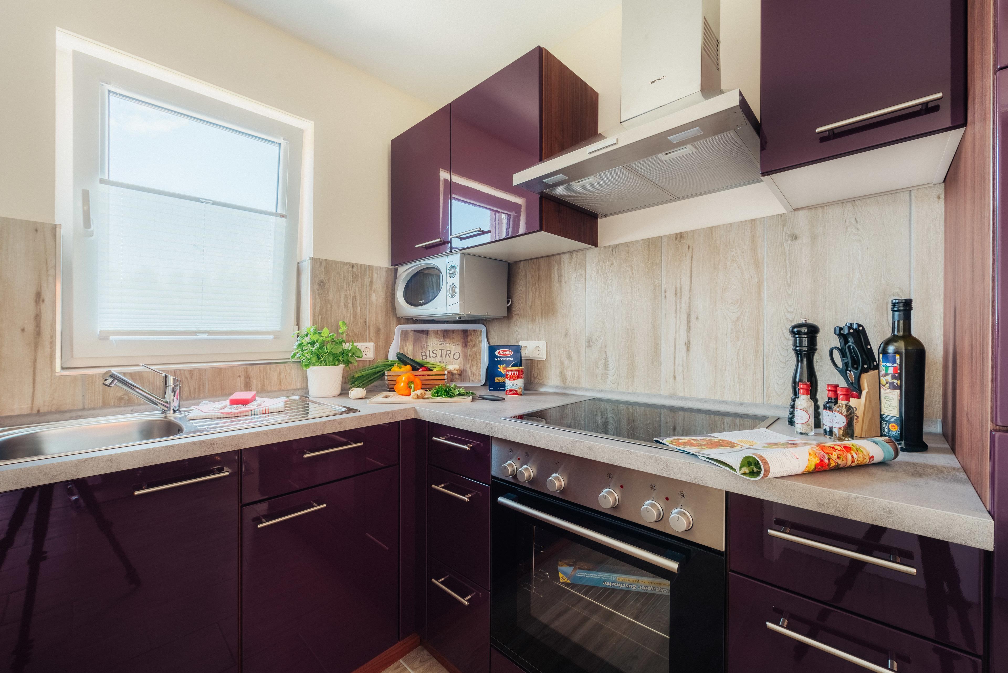 1 moderne vollausgestattete Küche mit Geschirrspüler, Mikrowelle, E-Herd (Ceran) mit Backofen, Kühl-/ Gefrierkombination, Toaster, Kaffeemaschine, Mikrowelle u.v.m.