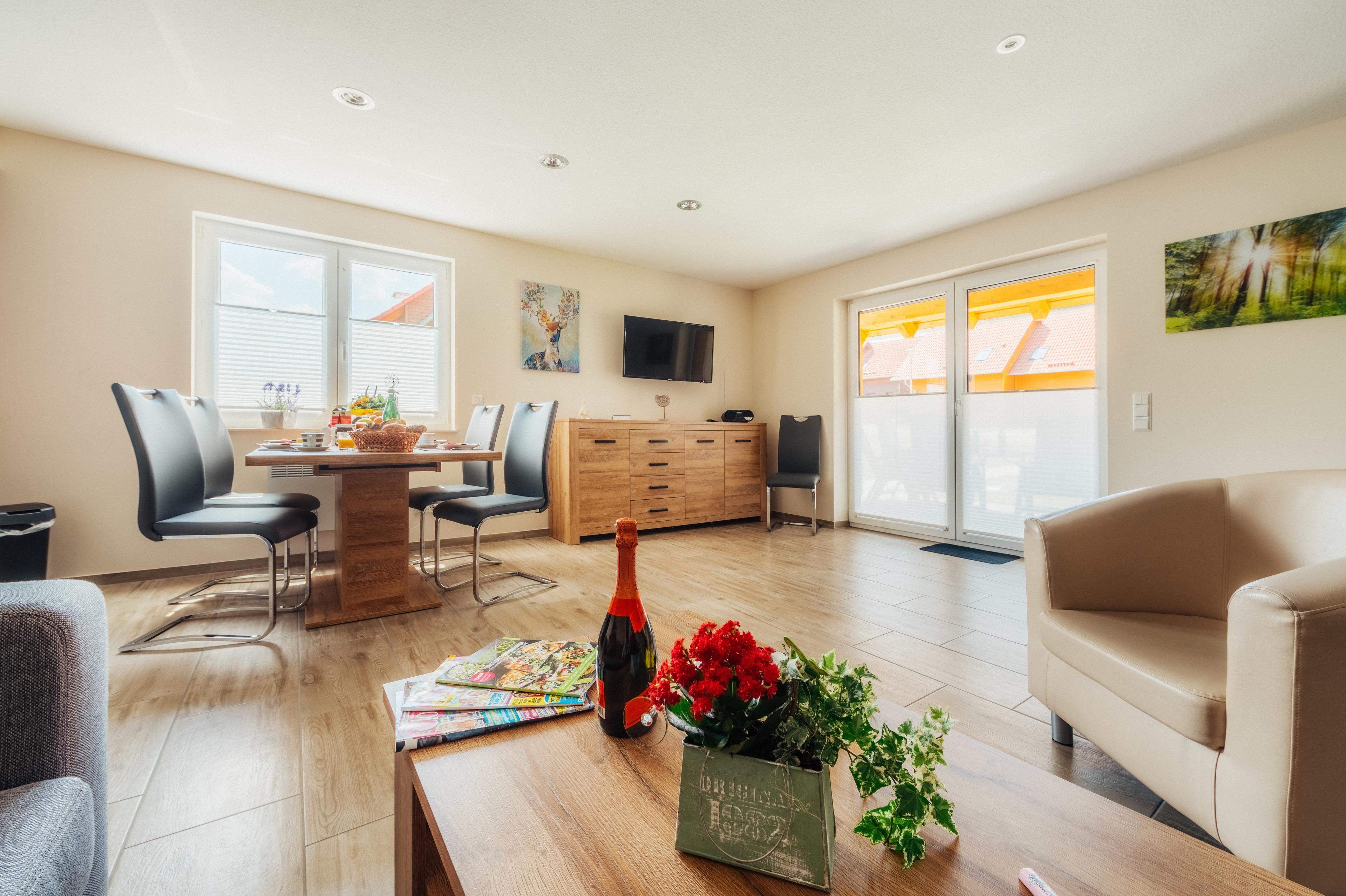 1 Wohn- / Essbereich mit Schlafcouch (für 1 - 2 Personen), großen Flachbildschirm