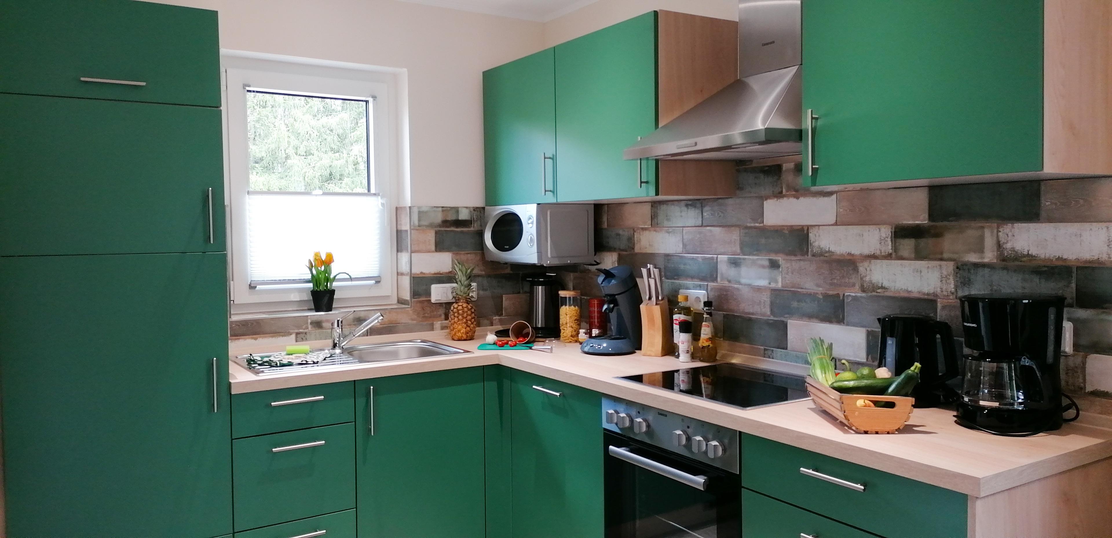 1 moderne vollausgestattete Küche mit Geschirrspüler, Mikrowelle, E-Herd (Ceran) mit Backofen, Kühl-/ Gefrierkombination, Toaster, Kaffeemaschine, Padmaschine, Mikrowelle u.v.m.