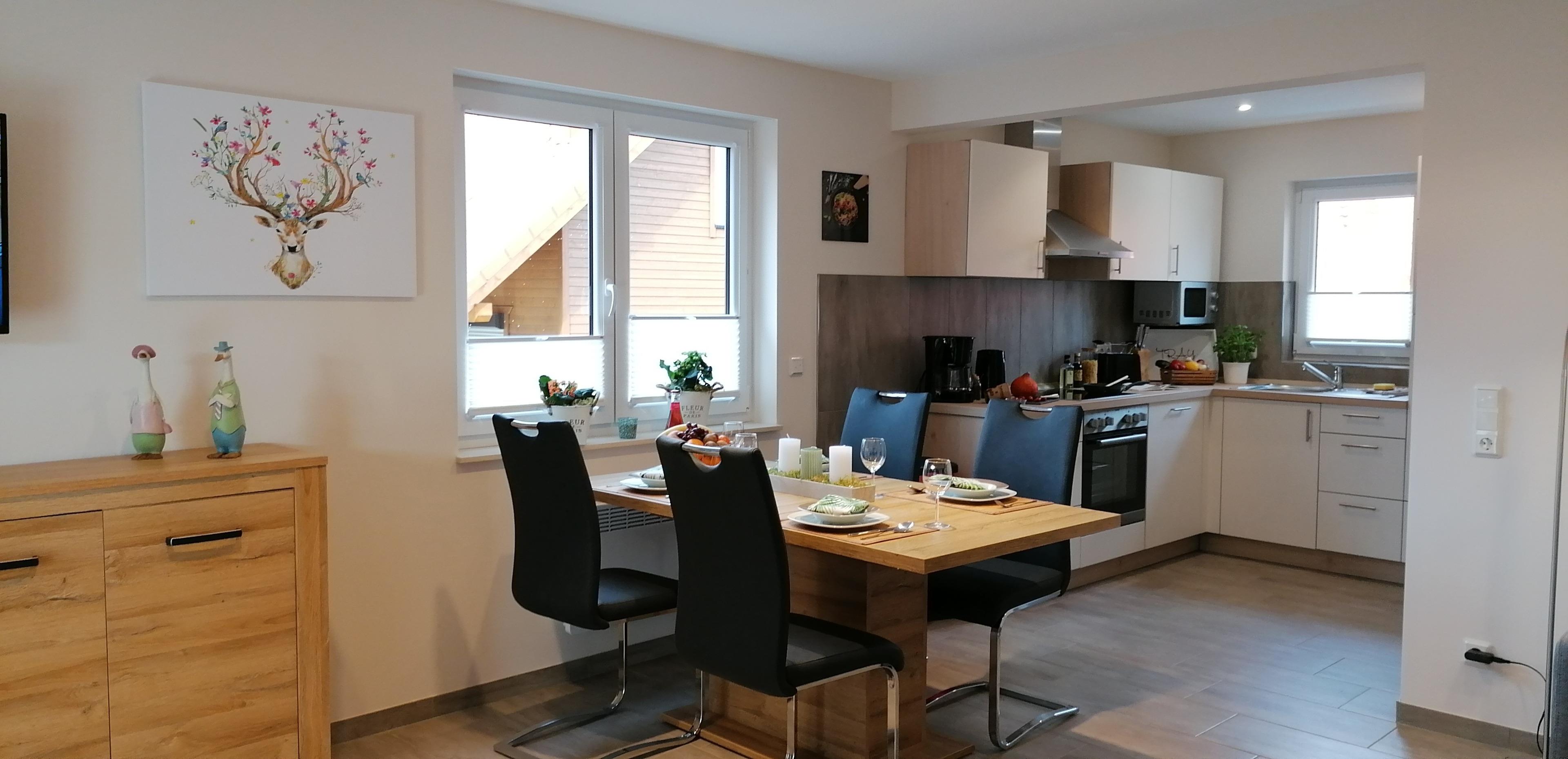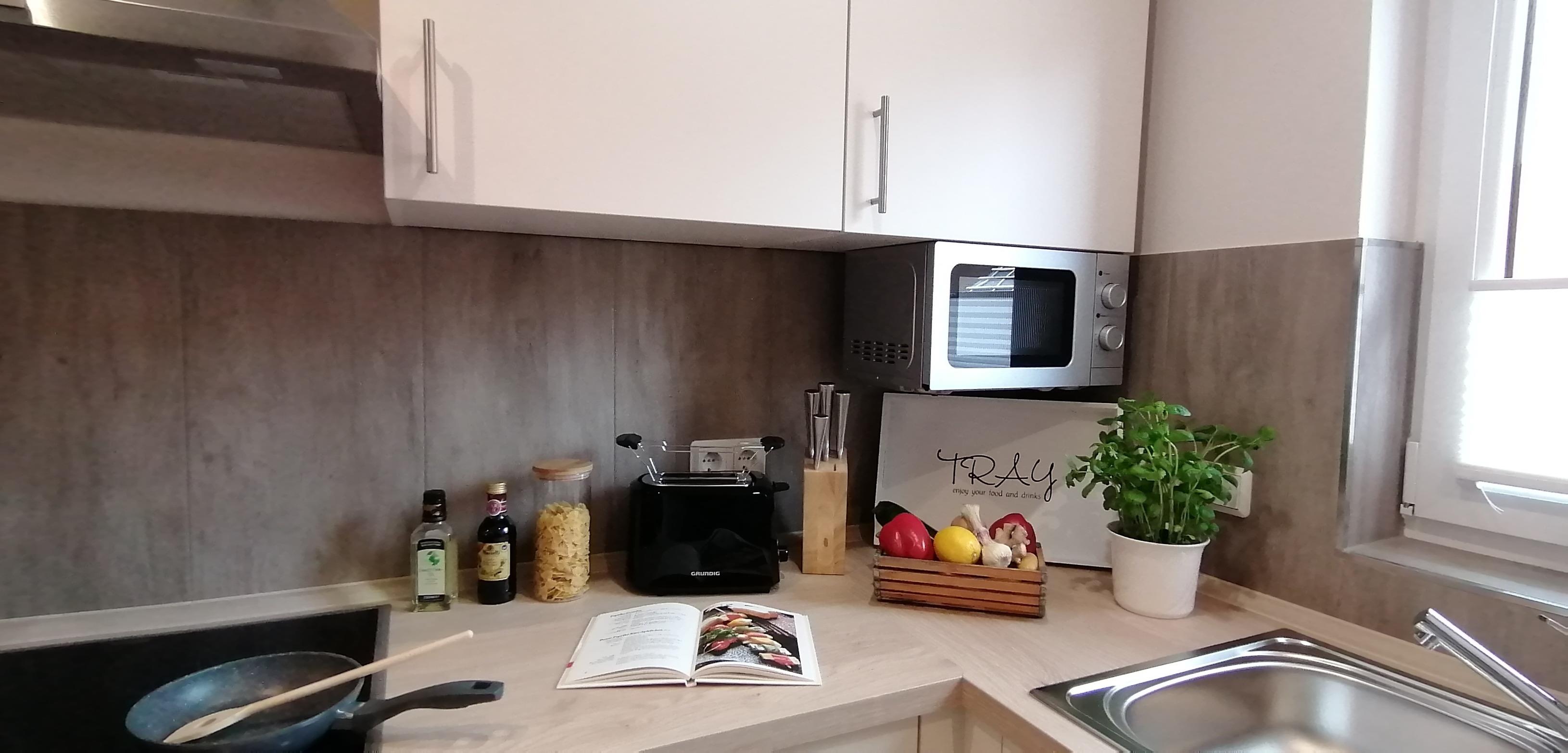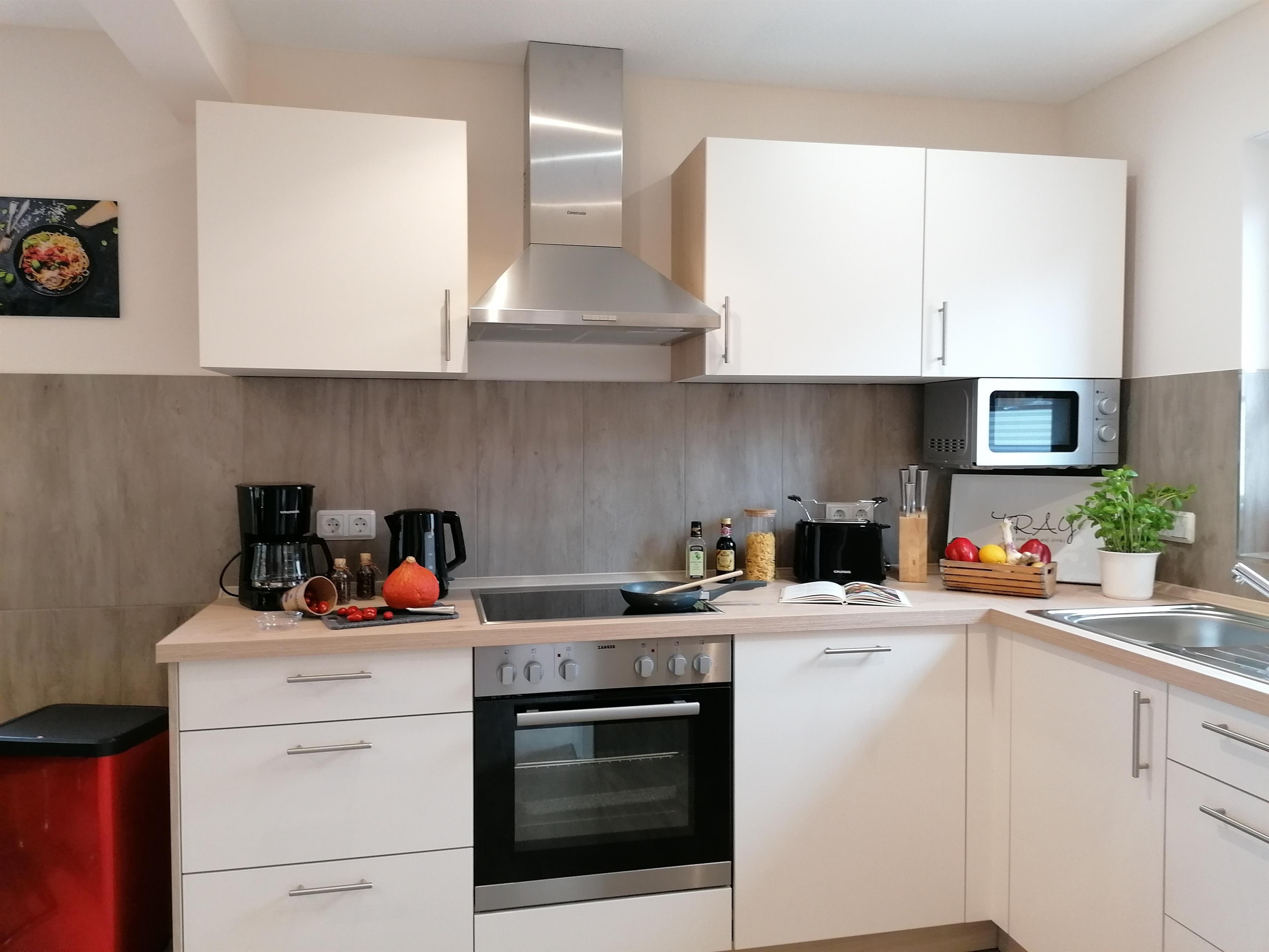 1 moderne vollausgestattete Küche mit Geschirrspüler, Mikrowelle, E-Herd (Ceran) mit Backofen, Kühl-/ Gefrierkombination, Toaster, Kaffeemaschine, Mikrowelle u.v.m.