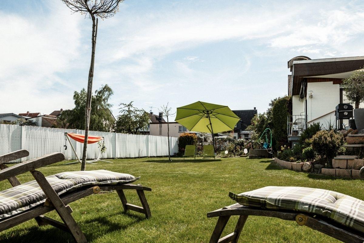 Neben der 500 qm großen Rasen-, Spiel-, und Liegefläche verfügt das Ferienhaus Spessartfeeling über eine lichte Terrasse mit Sonnensegel für schöne Stunden unter freiem Himmel. Es gibt zwei Tische und mit je vier Stühlen und somit auch Platz für eine größere fröhliche Runde. Zwei Sonnenschirme mit je zwei Liegen bieten an verschiedenen Stellen Schatten, eine separate Feuerschale mit Brennholz spendet Wärme und ein Grill Geselligkeit beim Gaumenschmaus.
