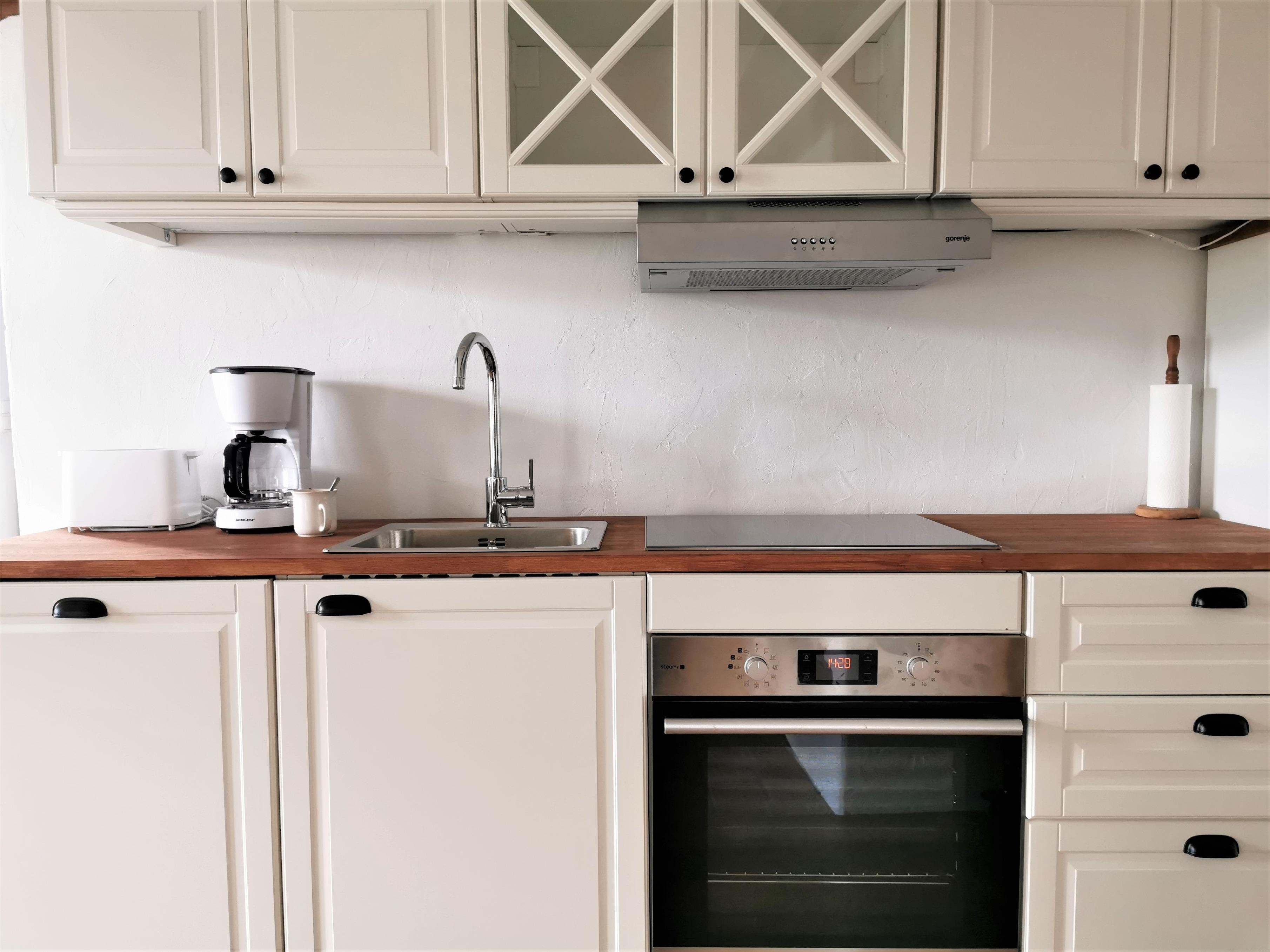 Im Erdgeschoss der Wohnung befindet sich der Wohnbereich, der mit einer bequemen Schlafcouch ausgestattet ist. Von dem Sofa haben sie einen schönen Blick in den kleinen Garten. Die Küchenzeile und der Essbereich sowie das Bad befindet sich ebenfalls im Erdgeschoss.