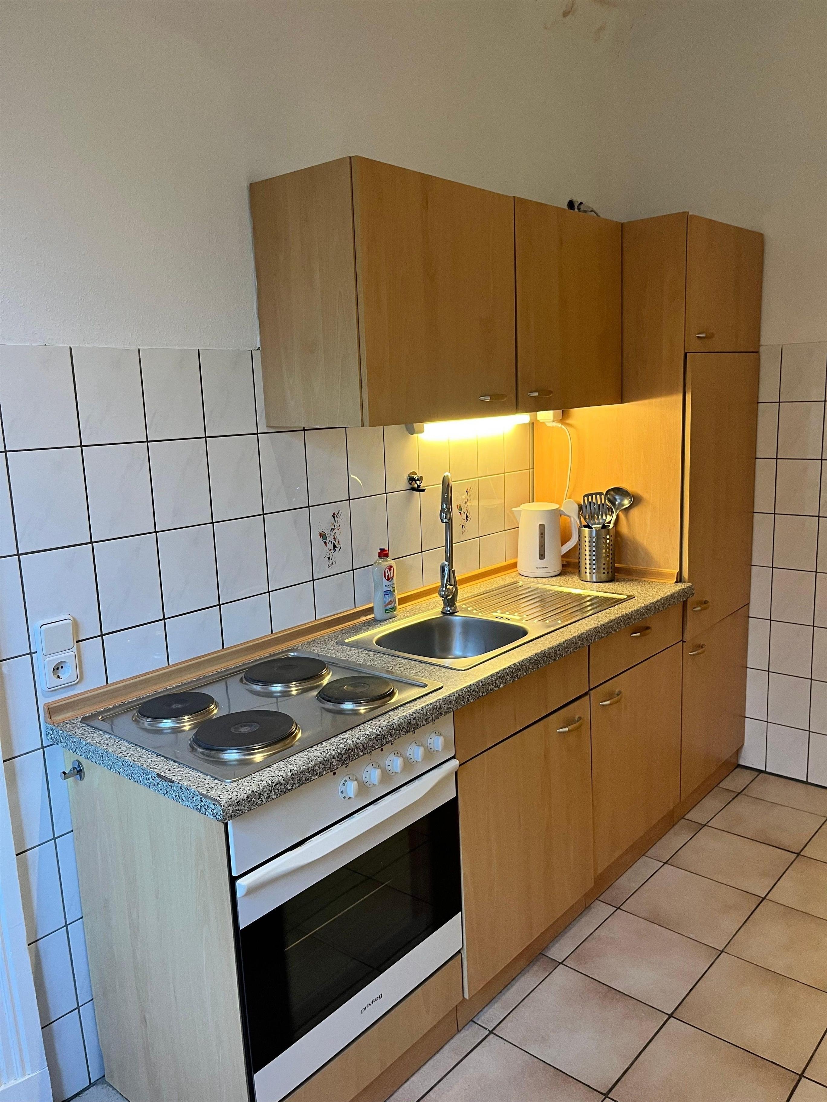 Die voll ausgestattete Küche umfasst einen Herd, eine Kaffeemaschine, einen Wasserkocher sowie diverses Geschirr und Kochutensilien für den täglichen Bedarf.