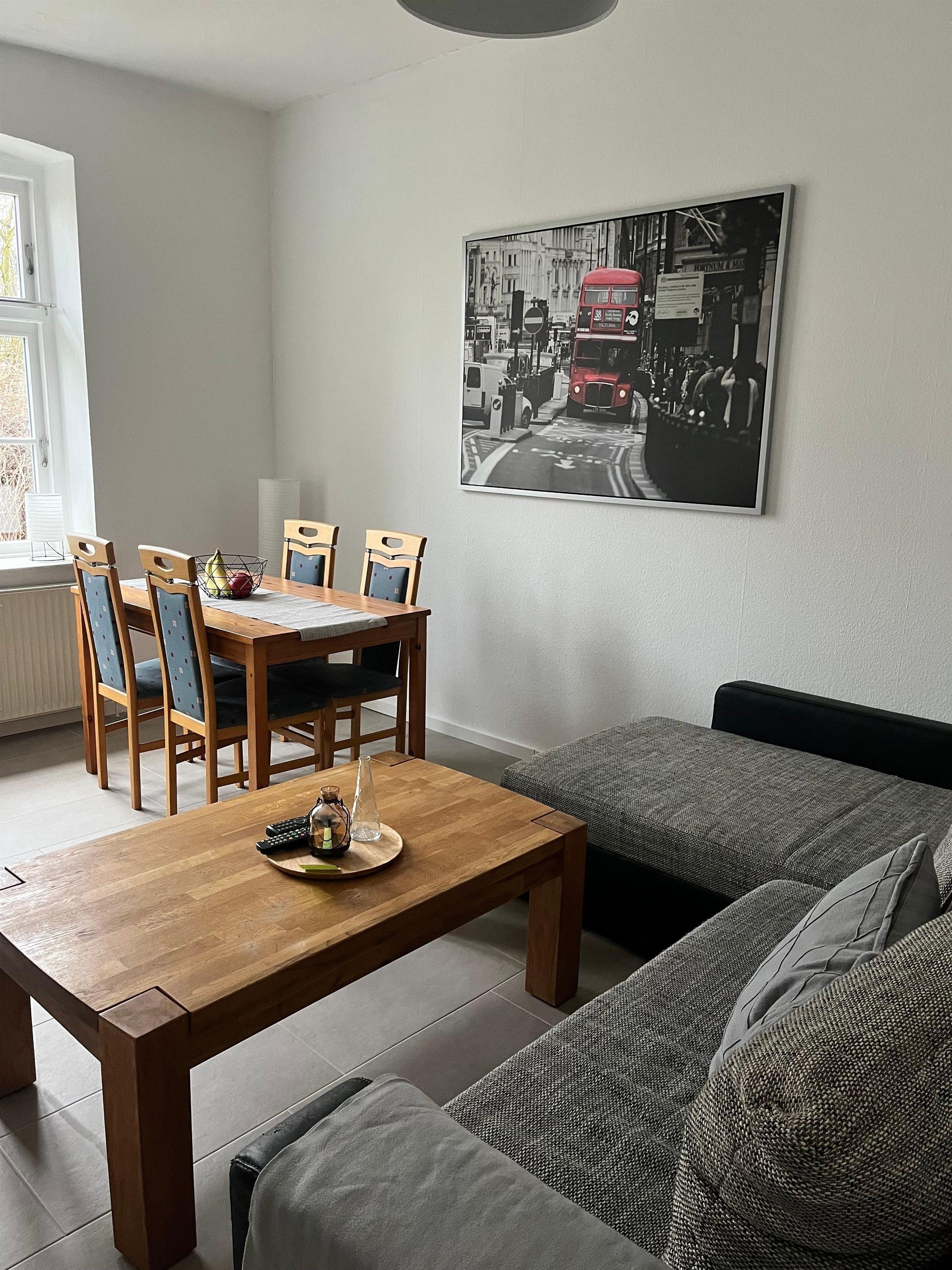Die 73 m² große Ferienwohnung bietet ausreichend Platz für einen komfortablen Aufenthalt. Sie verfügt über zwei Schlafzimmer, eines mit einem Doppelbett und eines mit einem Hochbett. Zusätzlich steht im großzügigen Wohnzimmer eine Schlafcouch mit zwei weiteren Schlafmöglichkeiten zur Verfügung.