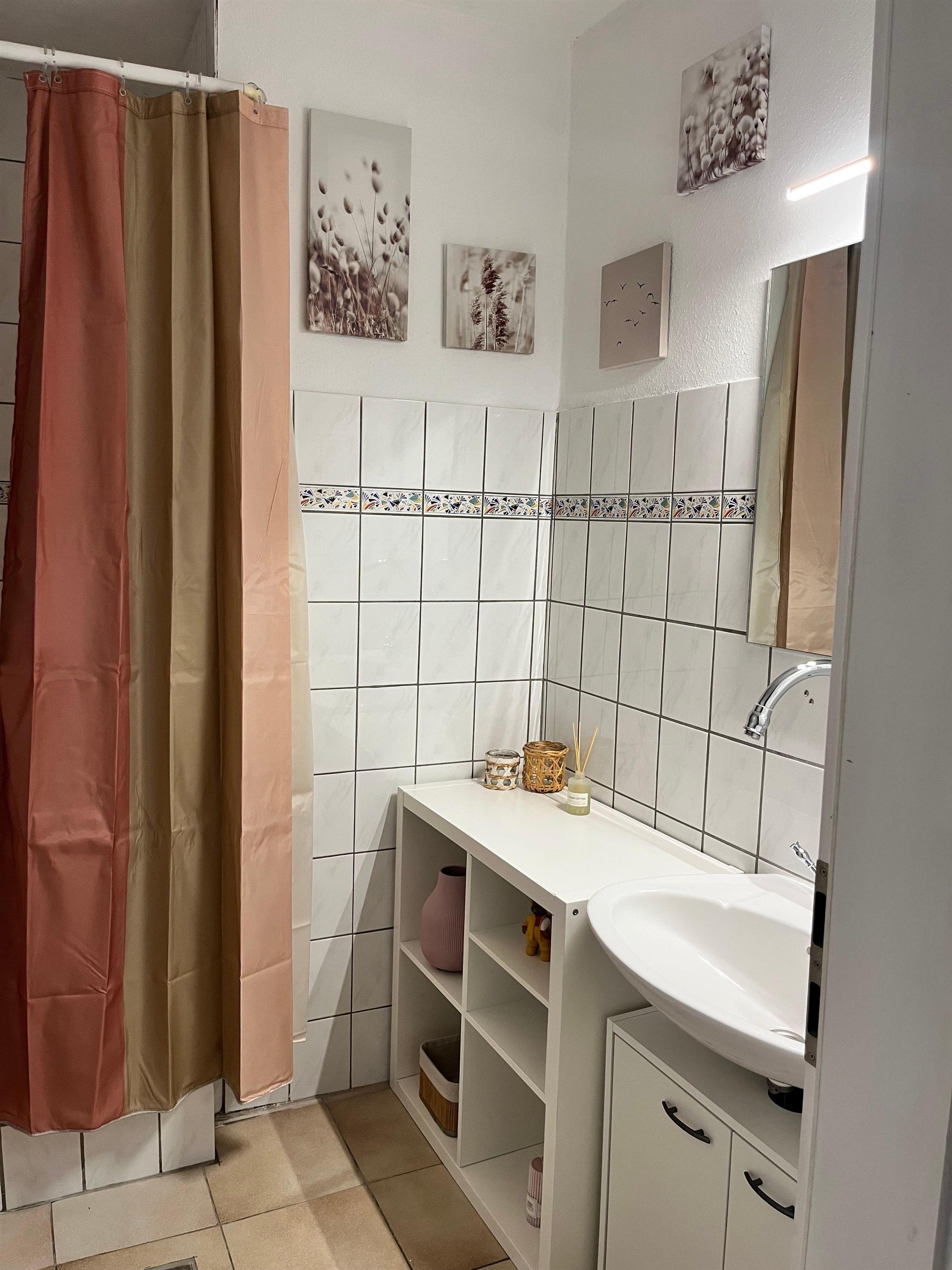 Das Badezimmer ist mit einer Dusche ausgestattet.