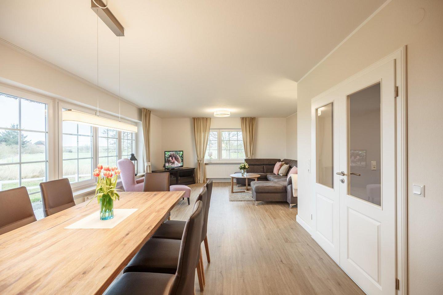 Zum Entspannen lädt auch das geschmackvolle Wohnzimmer mit dem Essbereich ein. Auch wenn Sie bei diesem Ausblick gar keinen Fernseher bräuchten, gehört dieser selbstverständlich zur Ausstattung dazu.