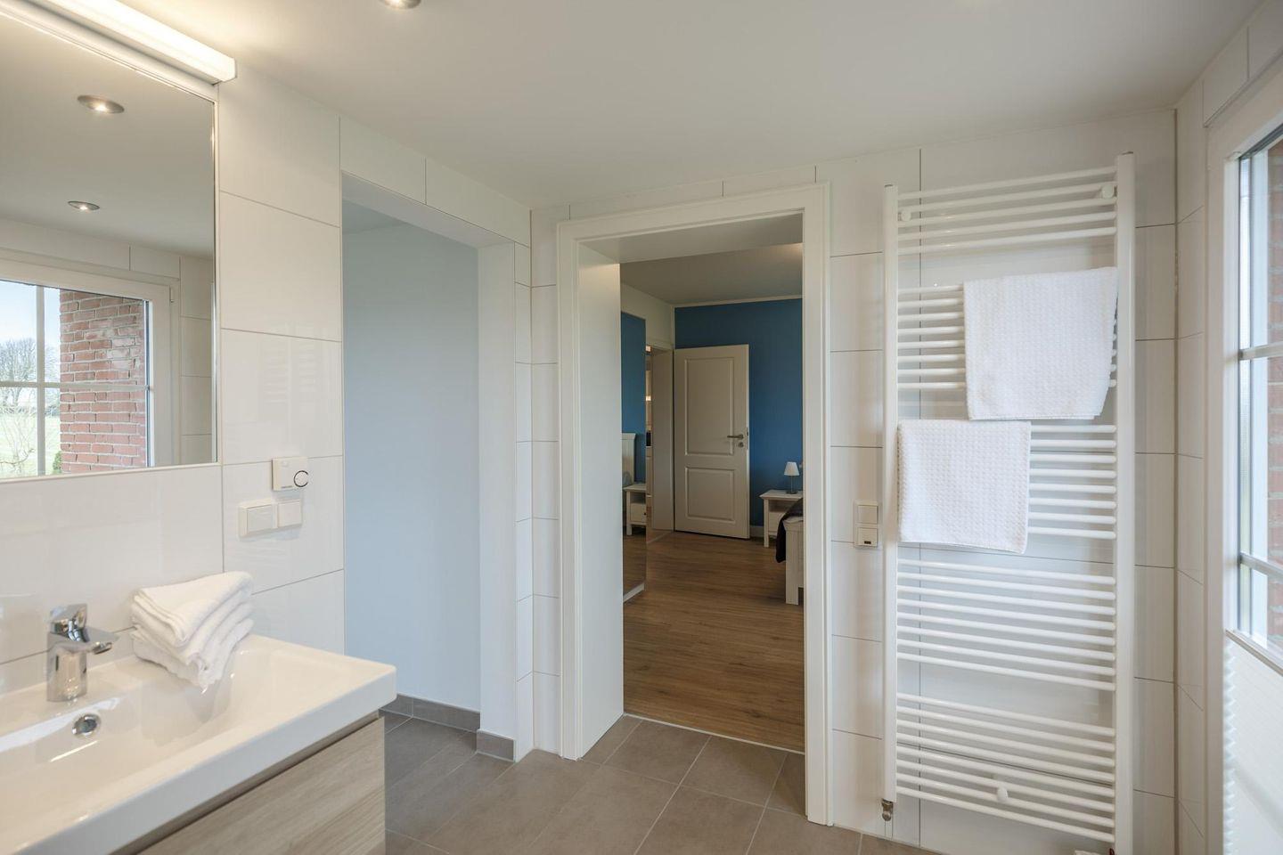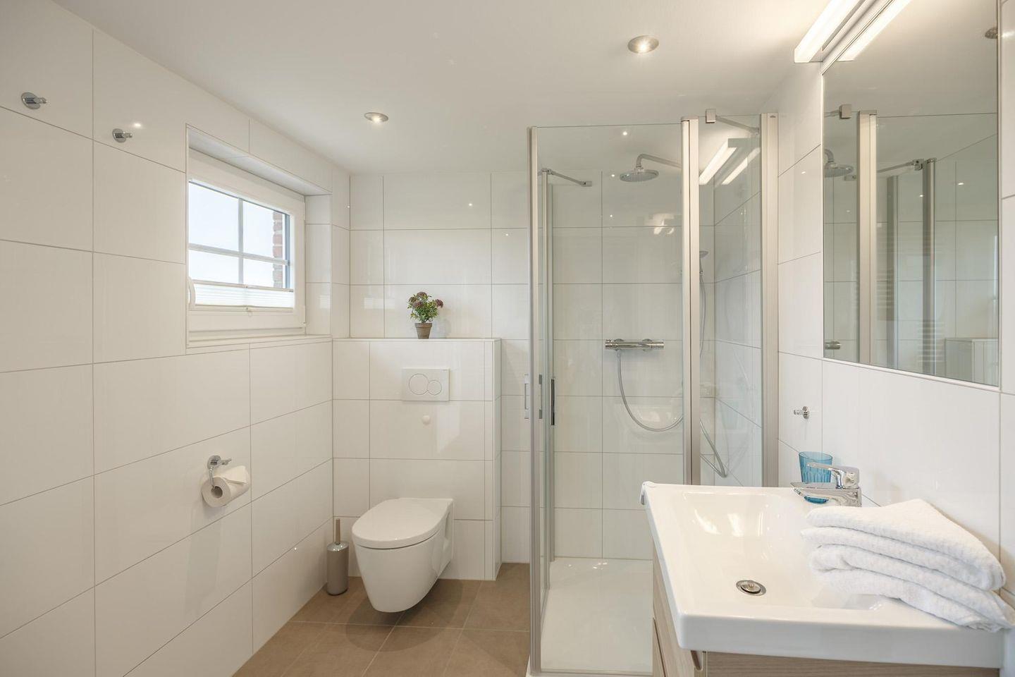 Das schicke Duschbad im Obergeschoss mit zwei Waschbecken und einer Waschmaschine, ein weiteres Duschbad im Erdgeschoss sowie ein Gäste-WC runden das Bild ab.