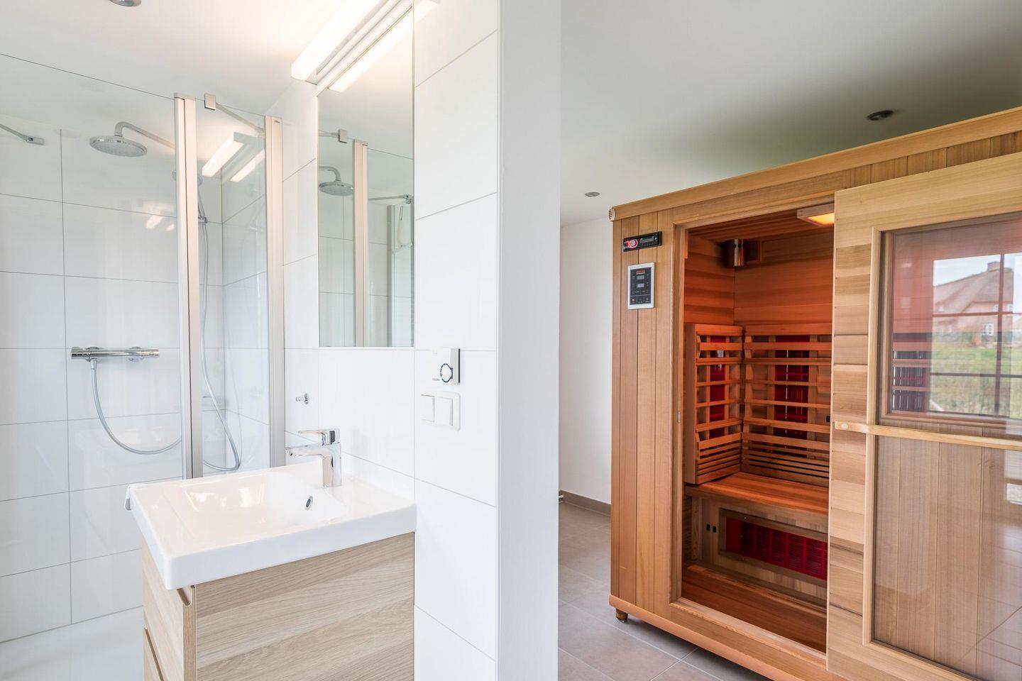 Das Ferienhaus ist mit seinen 150 qm Wohnfläche sehr geräumig. Es verfügt über vier Schlafzimmer: Eines befindet sich im Erdgeschoss (Bettengröße: 180 x 200) mit angrenzendem Duschbad und einer hochwertigen Infrarot-Sauna für 2–3 Personen, die anderen Schlafzimmer erreichen Sie über eine Treppe. Das Kinderschlafzimmer ist mit zwei getrennten Einzelbetten (90 × 200) ausgestattet, die anderen beiden Schlafzimmer mit bequemen Doppelbetten (180 x 200).