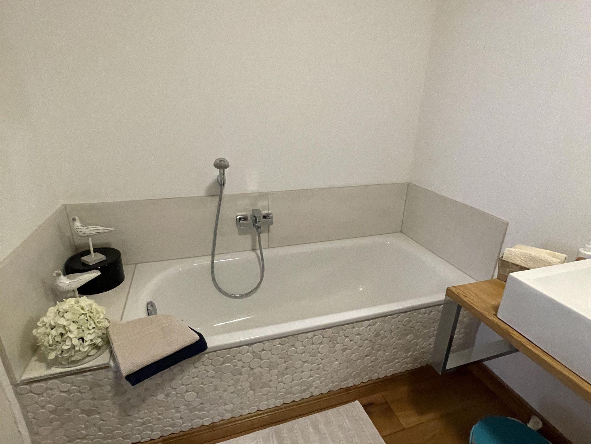 Das Badezimmer ist mit einer begehbaren Dusche , Badewanne und WC ausgetattet.