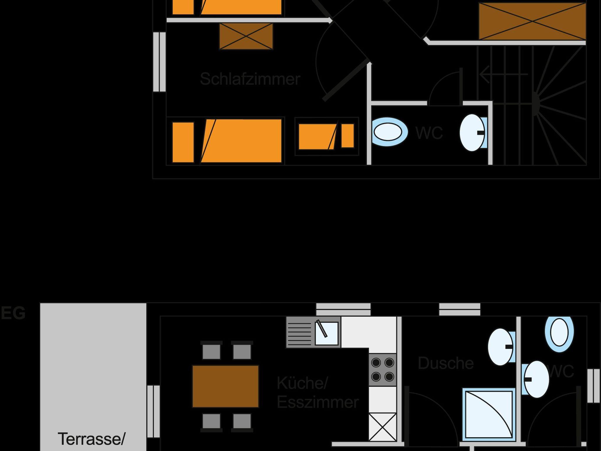 Das schöne, moderne Ferienhaus B ist für 5 Personen ausgelegt. Sie wohnen auf 2 Ebenen. Im Erdgeschoss befindet sich die Küche mit Backofen, Herd, Geschirrspüler, Kaffeemaschine und Wasserkocher. Außerdem befindet sich dort ein Esstisch. Das schöne Wohnzimmer mit SAT-TV und großer Couch lädt zum Verweilen ein. Das Ferienhaus verfügt im Erdgeschoss über eine Dusche und ein separates WC. Im Dachgeschoss befinden sich zwei Schlafräume. Im ersten Schlafzimmer befindet sich ein bequemes Doppelbett. Im zweiten Schlafzimmer stehen zwei Einzelbetten. Im Spielzimmer befindet sich ein Kinderbett. Außerdem befindet sich auf dem Stockwerk ein weiteres WC. Auf dem schönen Balkon und der Terrasse können Sie die Sonne genießen.