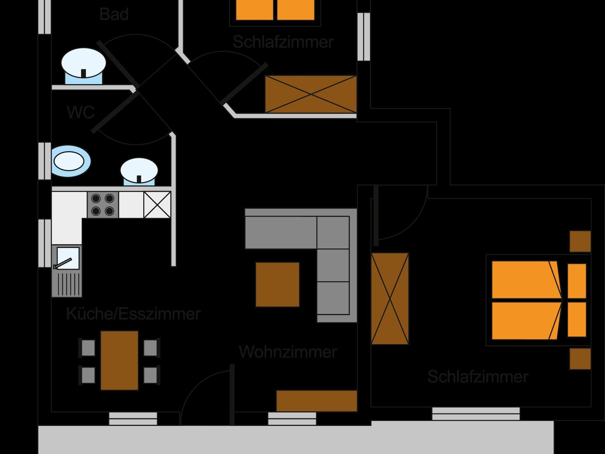 Die moderne Ferienwohnung 4 ist 70 qm groß und für 4 Personen ausgelegt. Die Ferienwohnung verfügt über Küche mit Wasserkocher, Mikrowelle, Kaffeemaschine, Toaster, Kühl-Gefrier-Kombination, Spülmaschine, Kaminofen und Esstisch. Der Wohnbereich mit Couch und SAT-TV lädt zum Verweilen ein. Zum Schlafen gibt es zwei Schlafzimmer mit Doppelbetten. In einem davon gibt es zusätzlich noch ein Gitterbett. Das Badezimmer ist mit Dusche und Waschplatz ausgestattet.Separates WC. Auf der schönen Terrasse können Sie die Sonne genießen. Bettwäsche und Handtücher sind inklusive und auch Waschmaschine und Trockner sind vorhanden. Haustiere dürfen allerdings nicht mitgebracht werden.