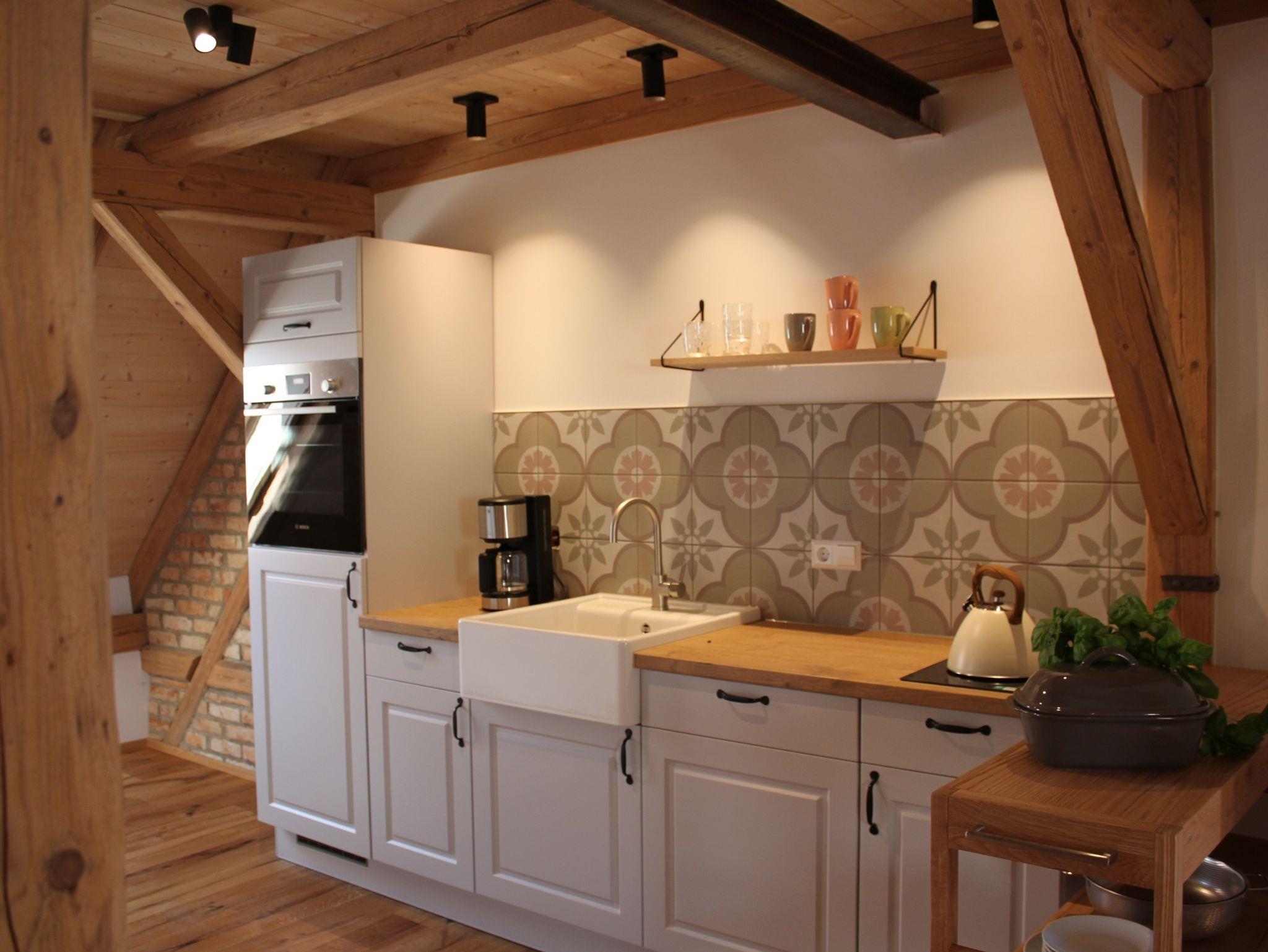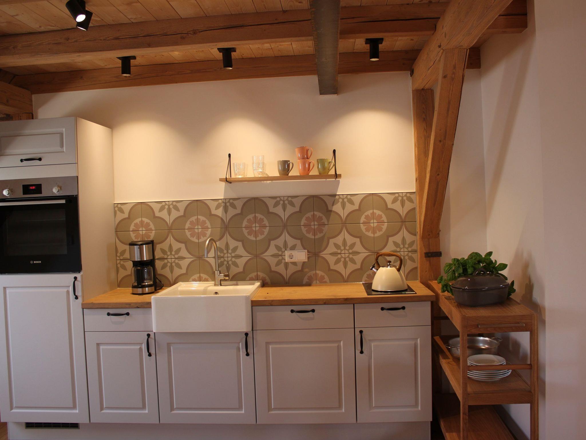 voll ausgestattete Küche mit E-Herd, Backofen, Geschirrspüler, Kaffeemaschine, Wasserkocher