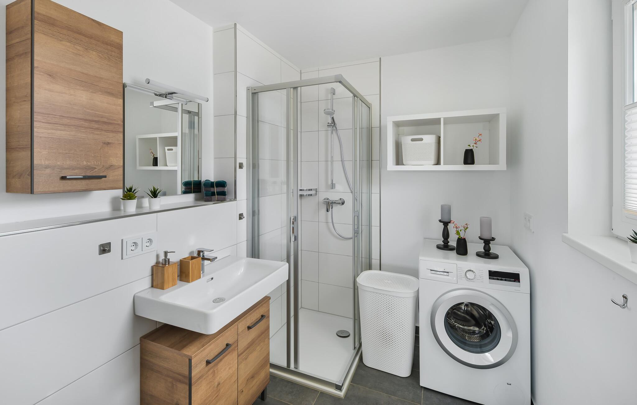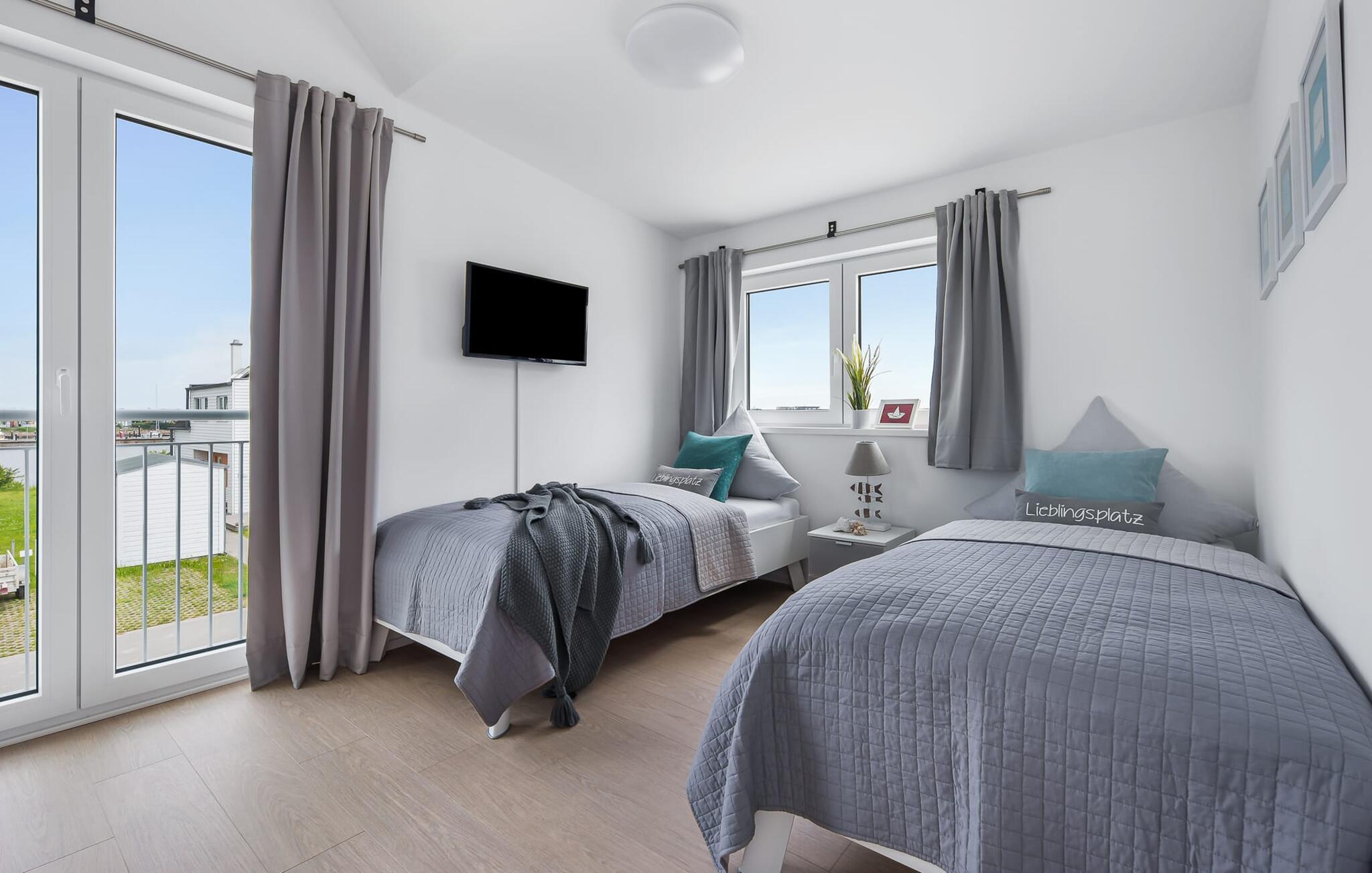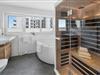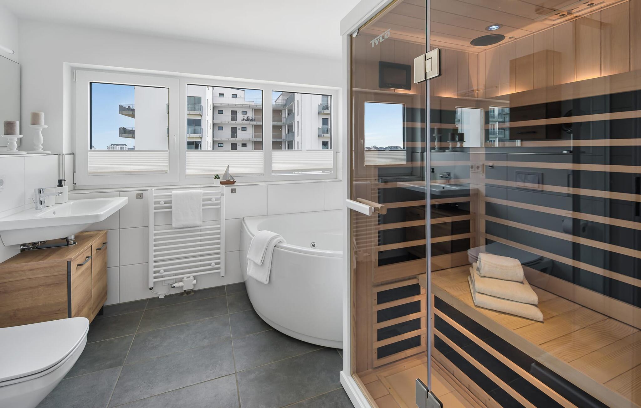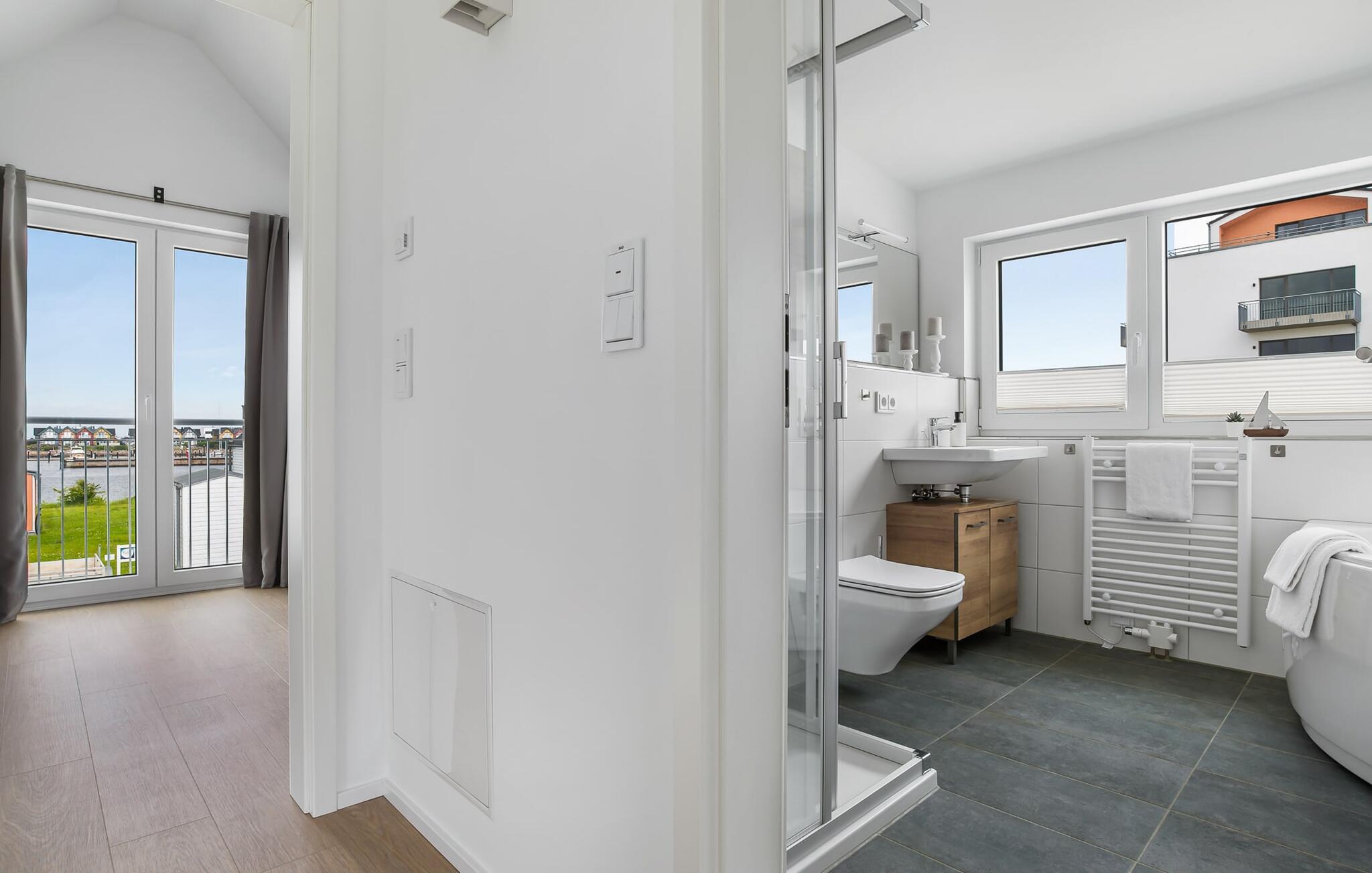 GlückSEEligkeit-huset byder på luksusen med to badeværelser på hvert boligniveau. Infrarød sauna, spabad og bruser med udsigt til vandet på første sal lover ren wellness. Et brusebad i stueetagen giver ekstra komfort.