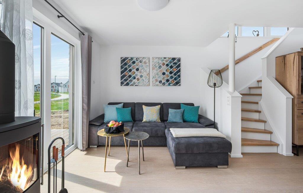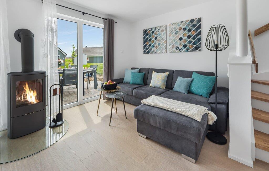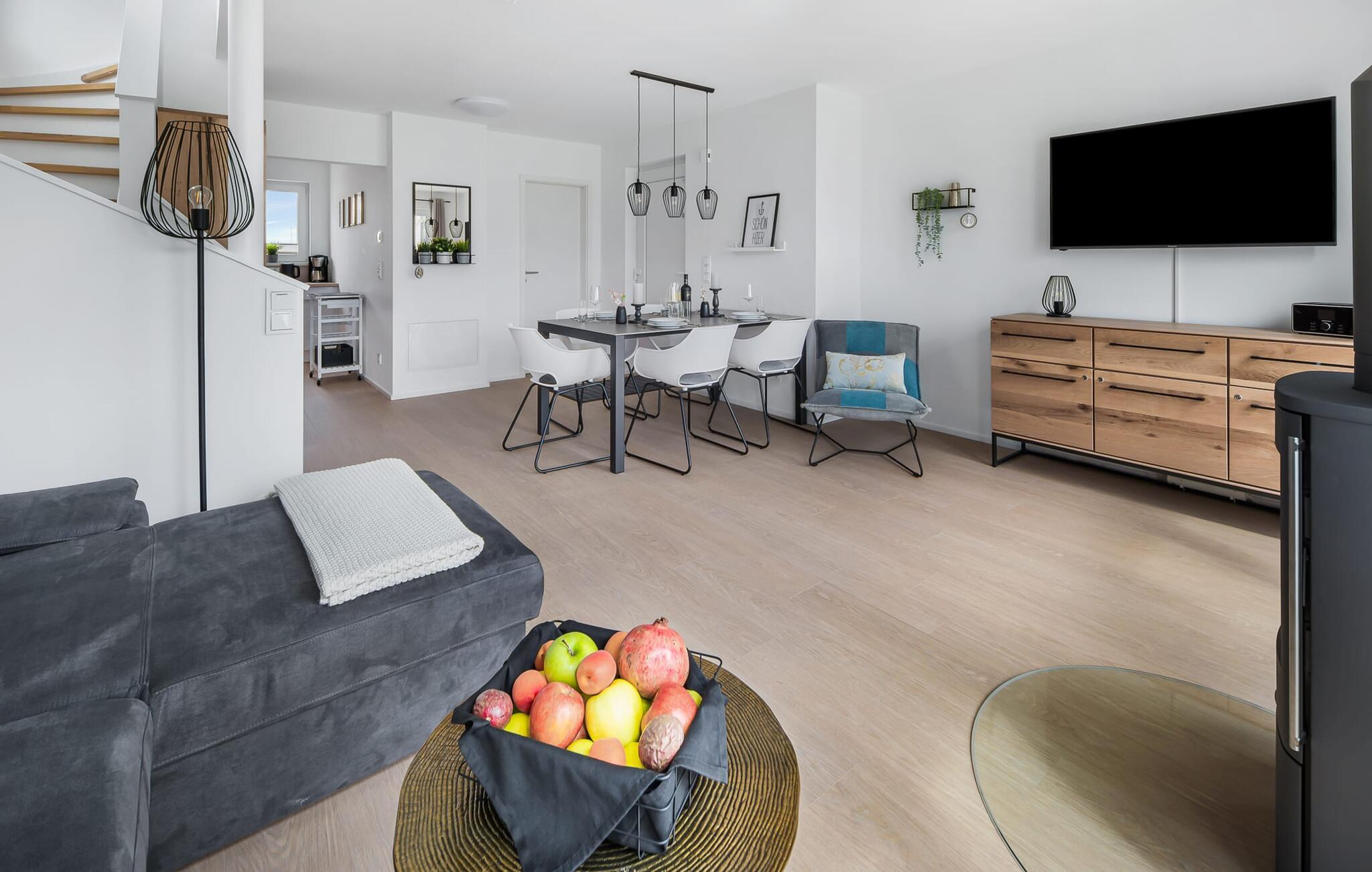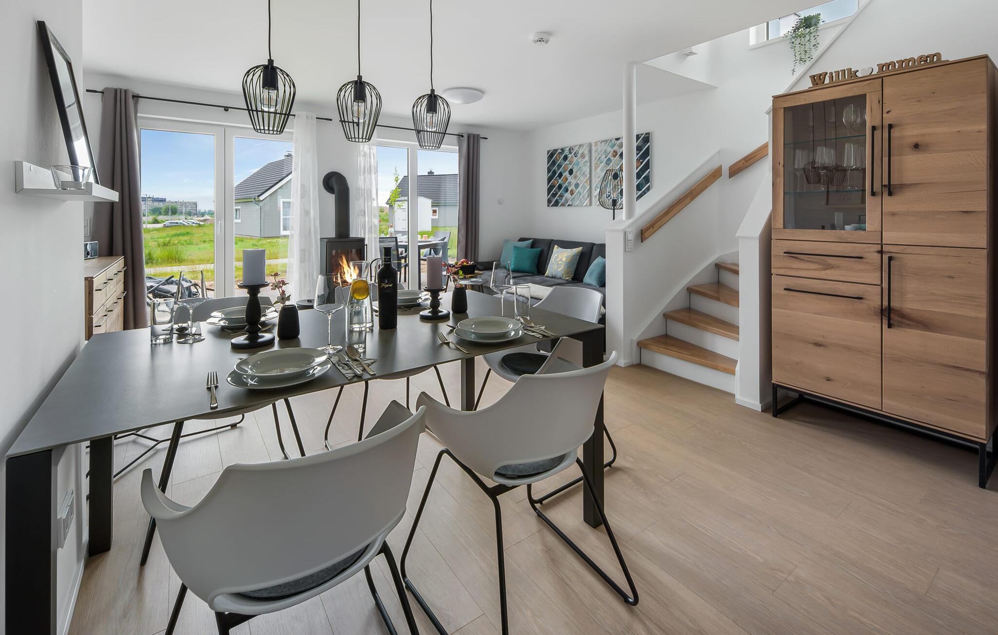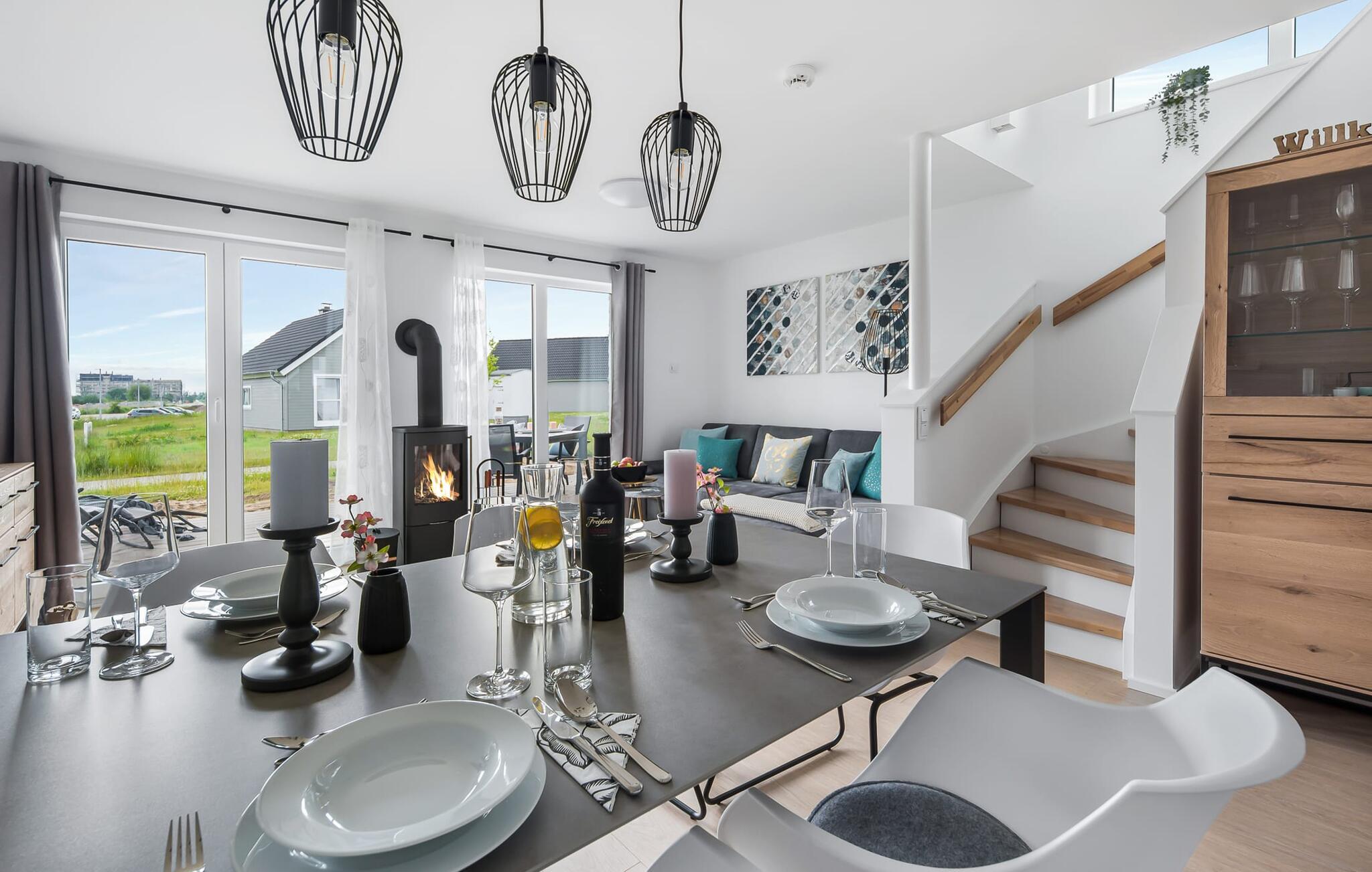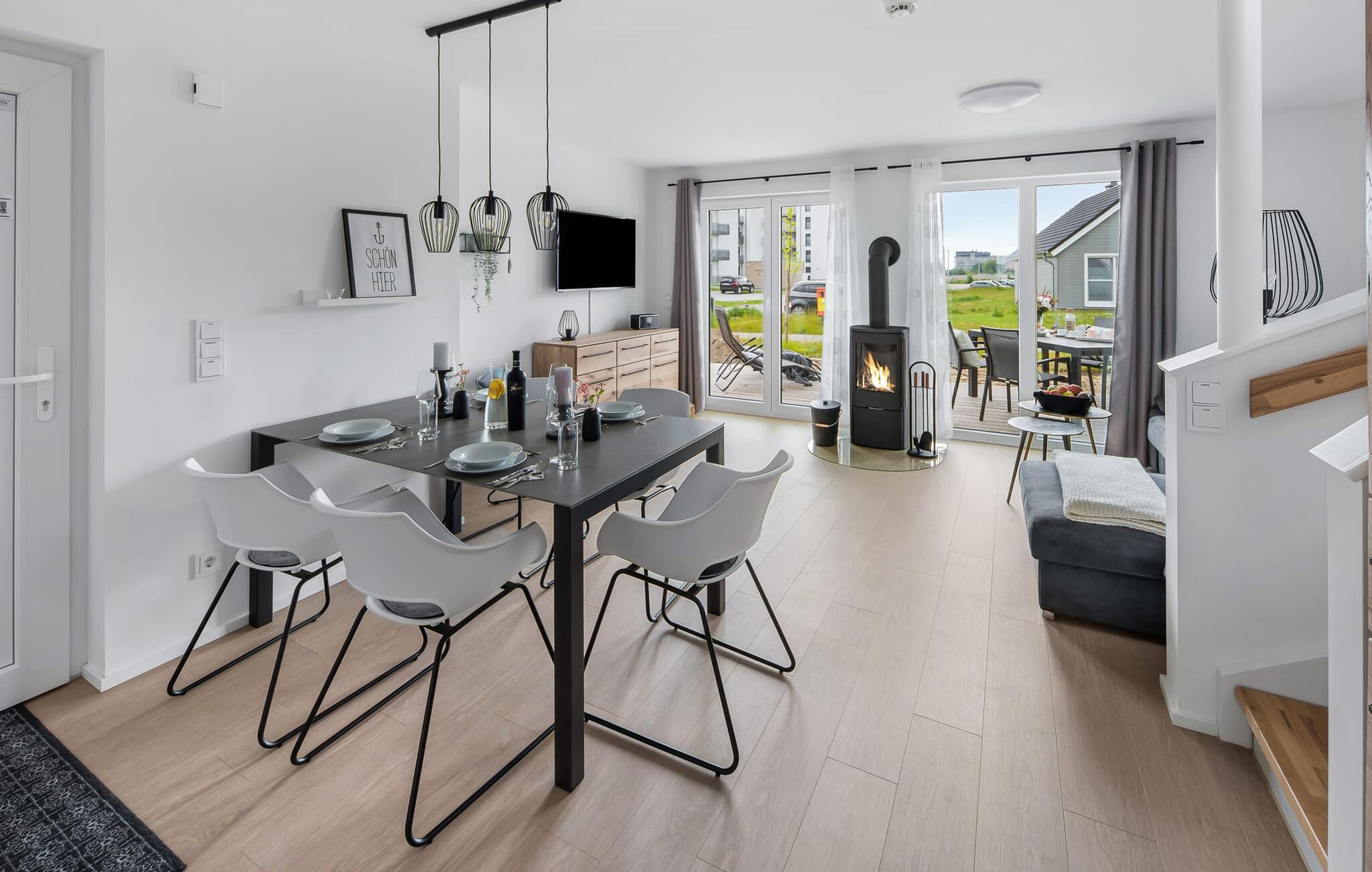 I den åbne opholdsstue i stueetagen kan du nyde fuld feriekomfort, uanset om du spiser sammen eller tilbringer hyggelige timer ved pejsen.